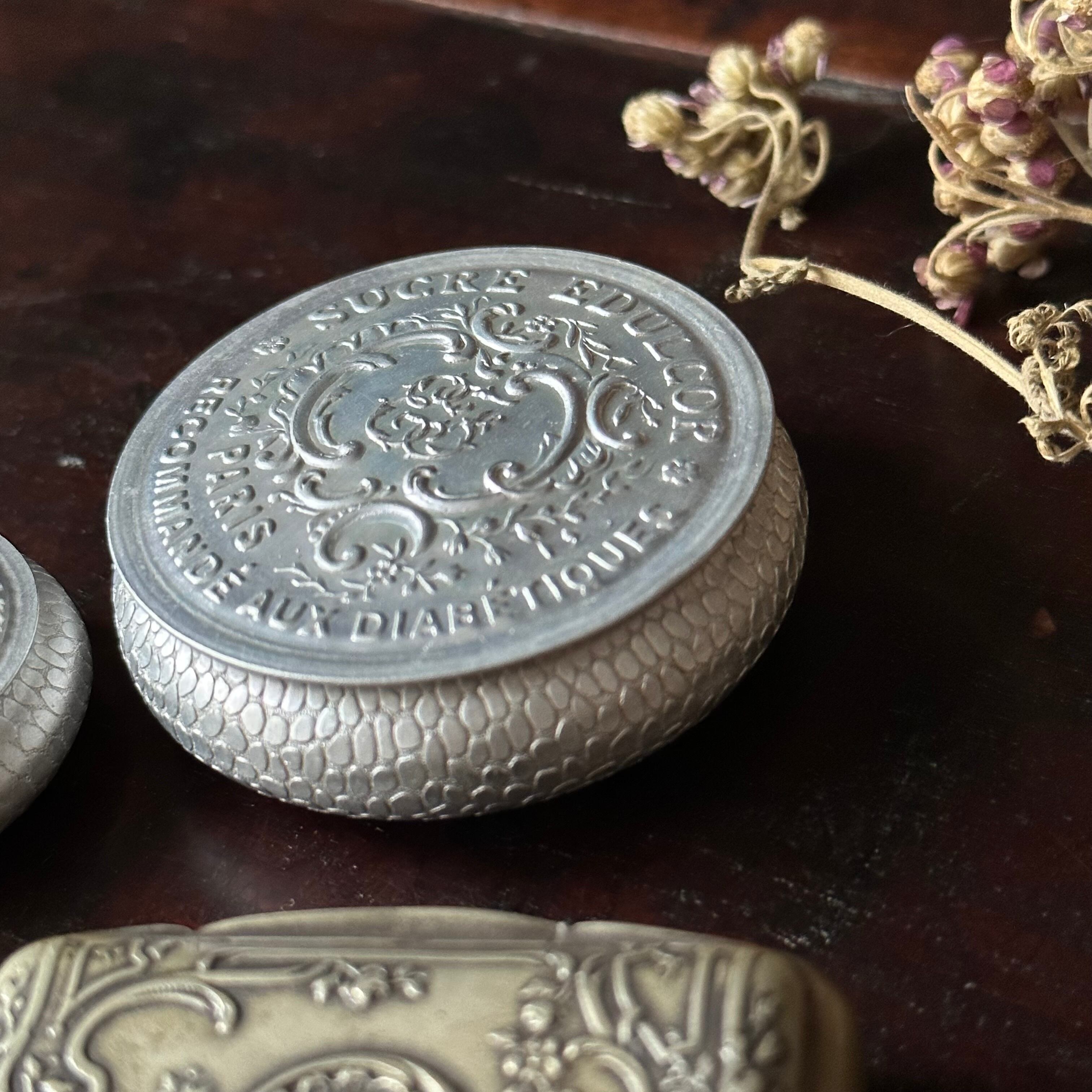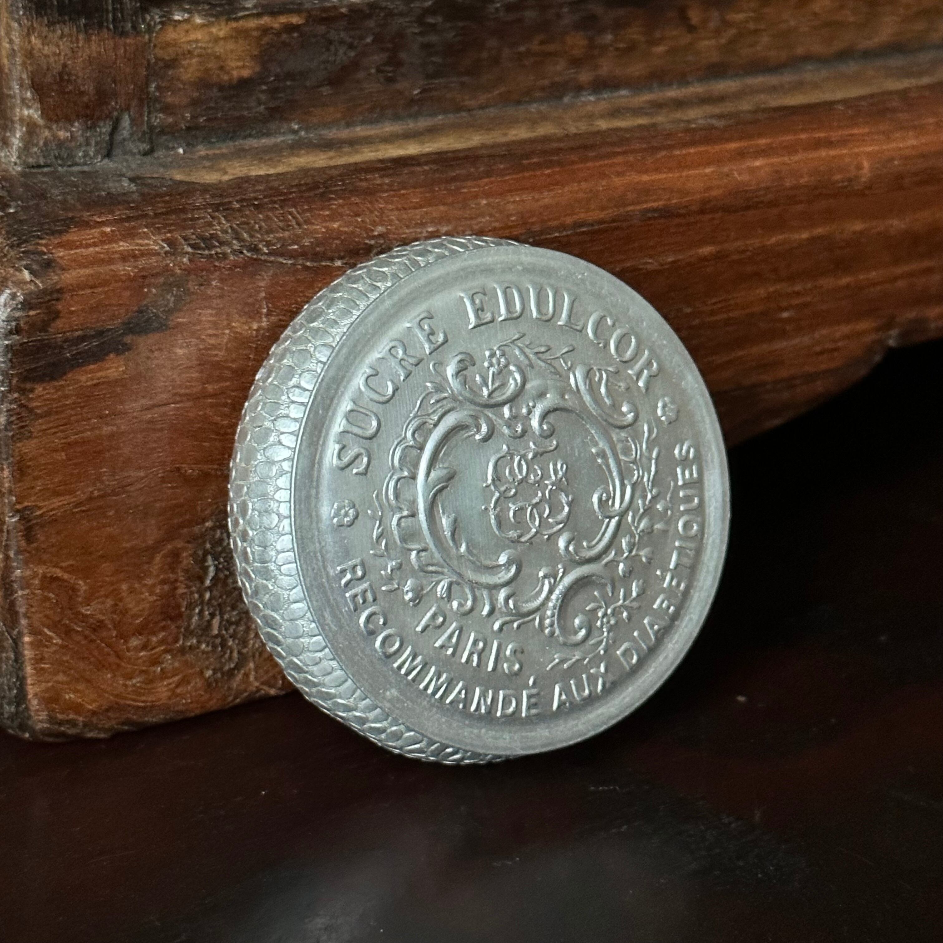 蓋には「SUCRE EDULCOR」「PARIS」「RECOMMANDÉ AUX DIABÉTIQUES」とあり、甘味料が入っていたもので、1900年代前期のもののようです。