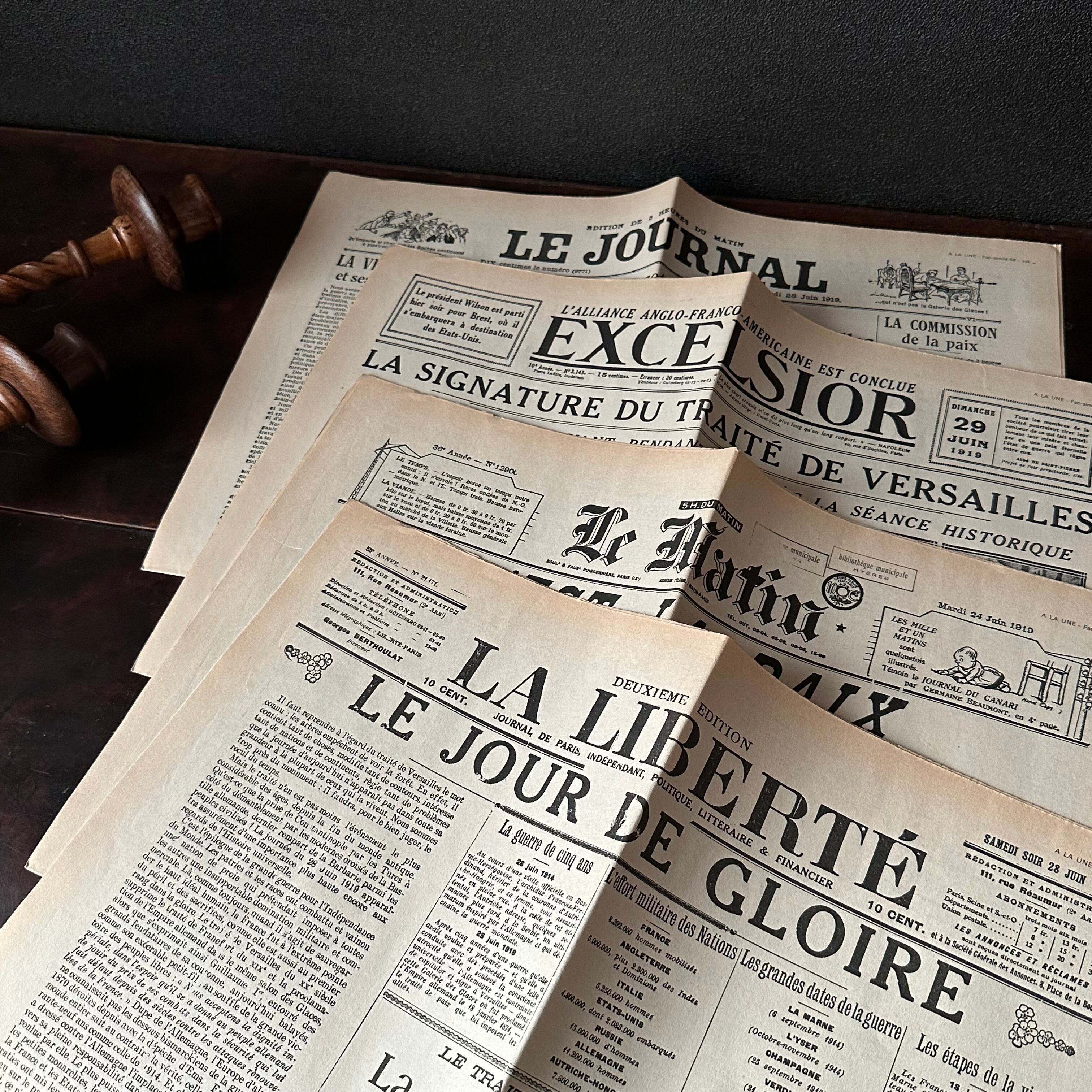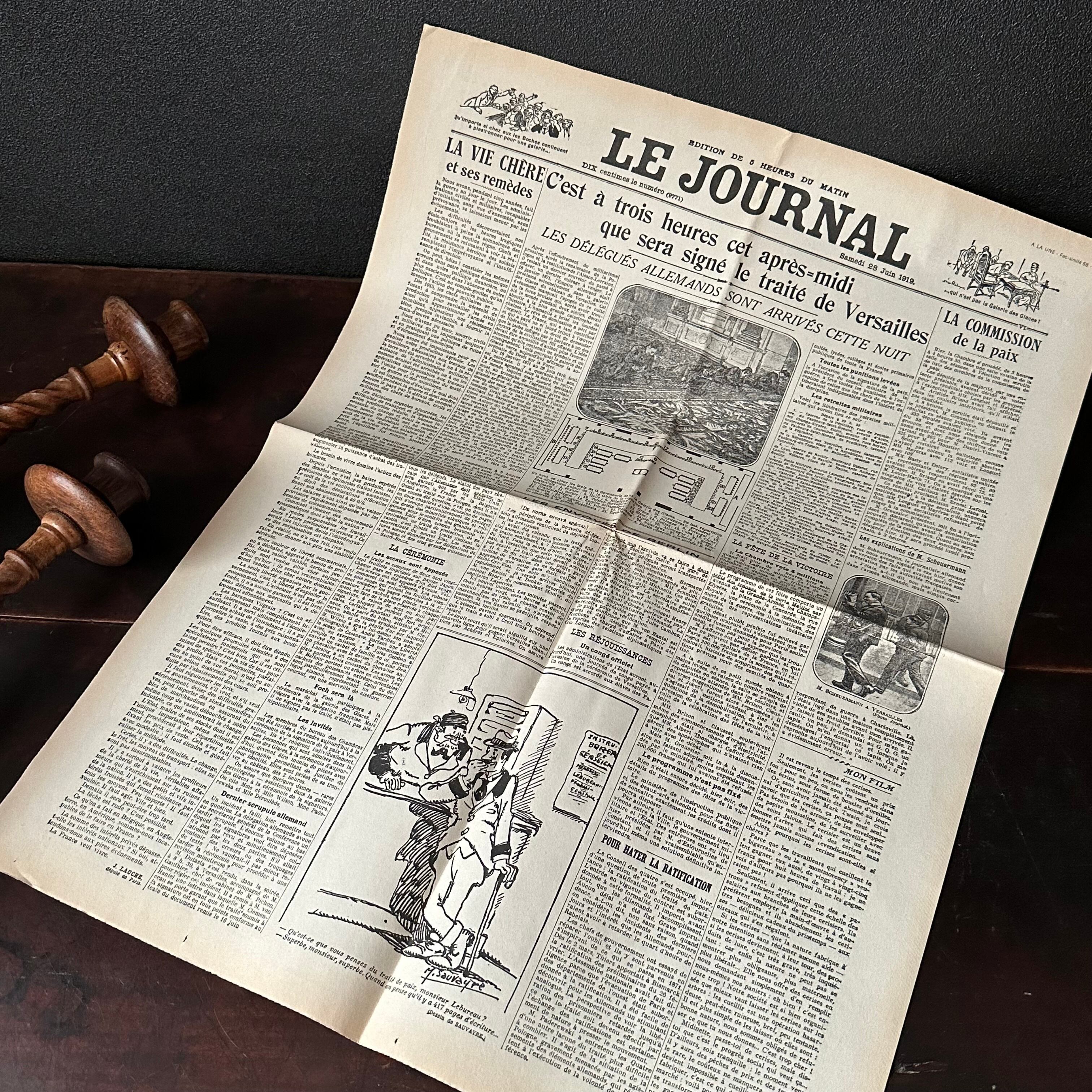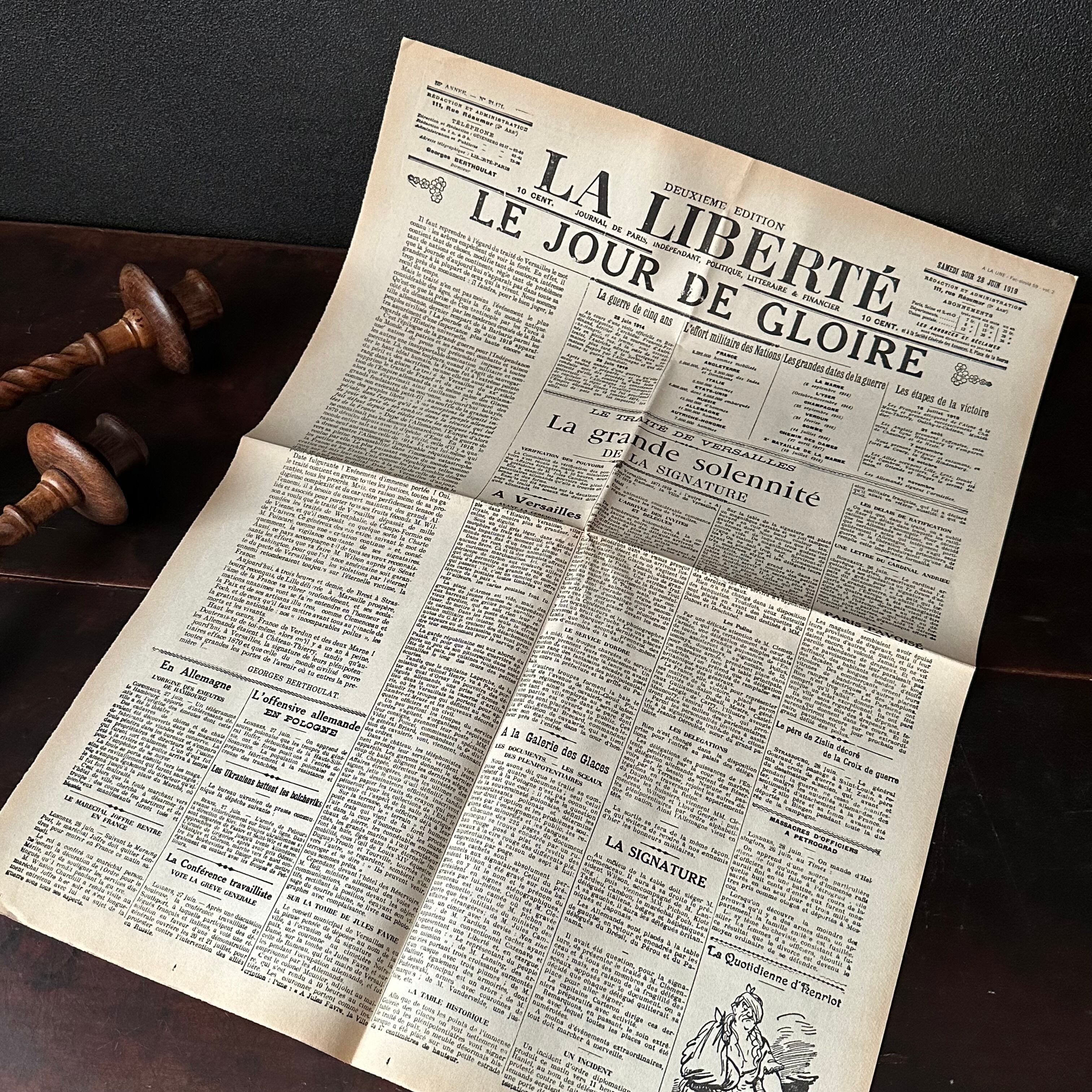 こちらの新聞は1919年ベルサイユ条約が調印された頃のもののようです。ベルサイユ条約について書かれた記事が多く取り上げられ写真も多く掲載されており、この時代の出来事を知ることの出来る貴重なお品ですね。