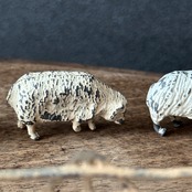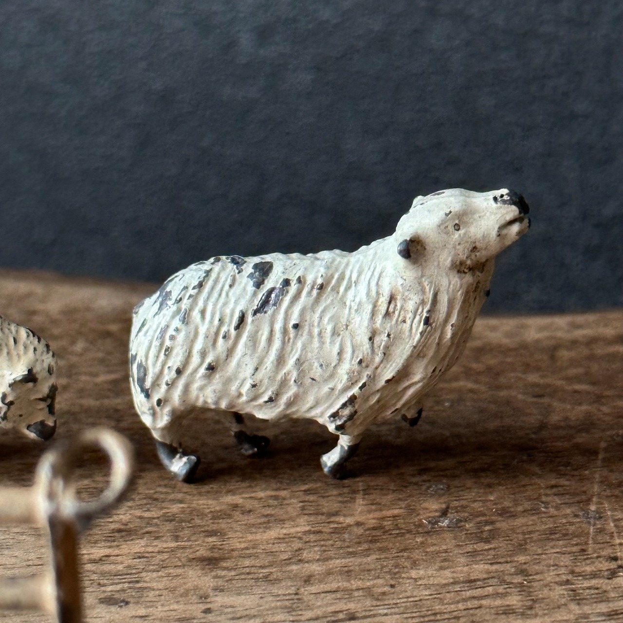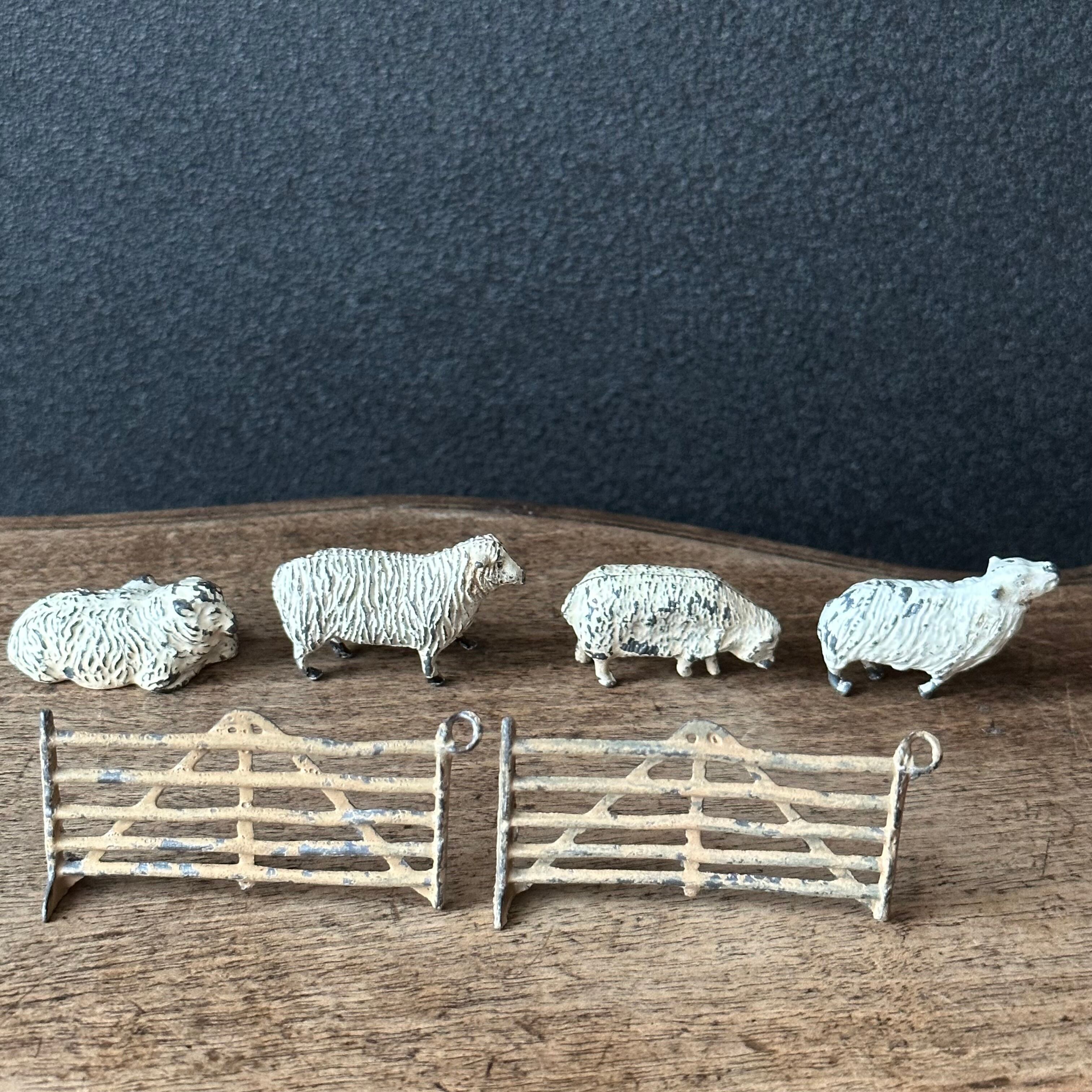 1900年代前半までイギリスのおもちゃメーカーによって盛んに作られていた古い鉛製のミニチュア、羊4匹と柵2個のセットです。
