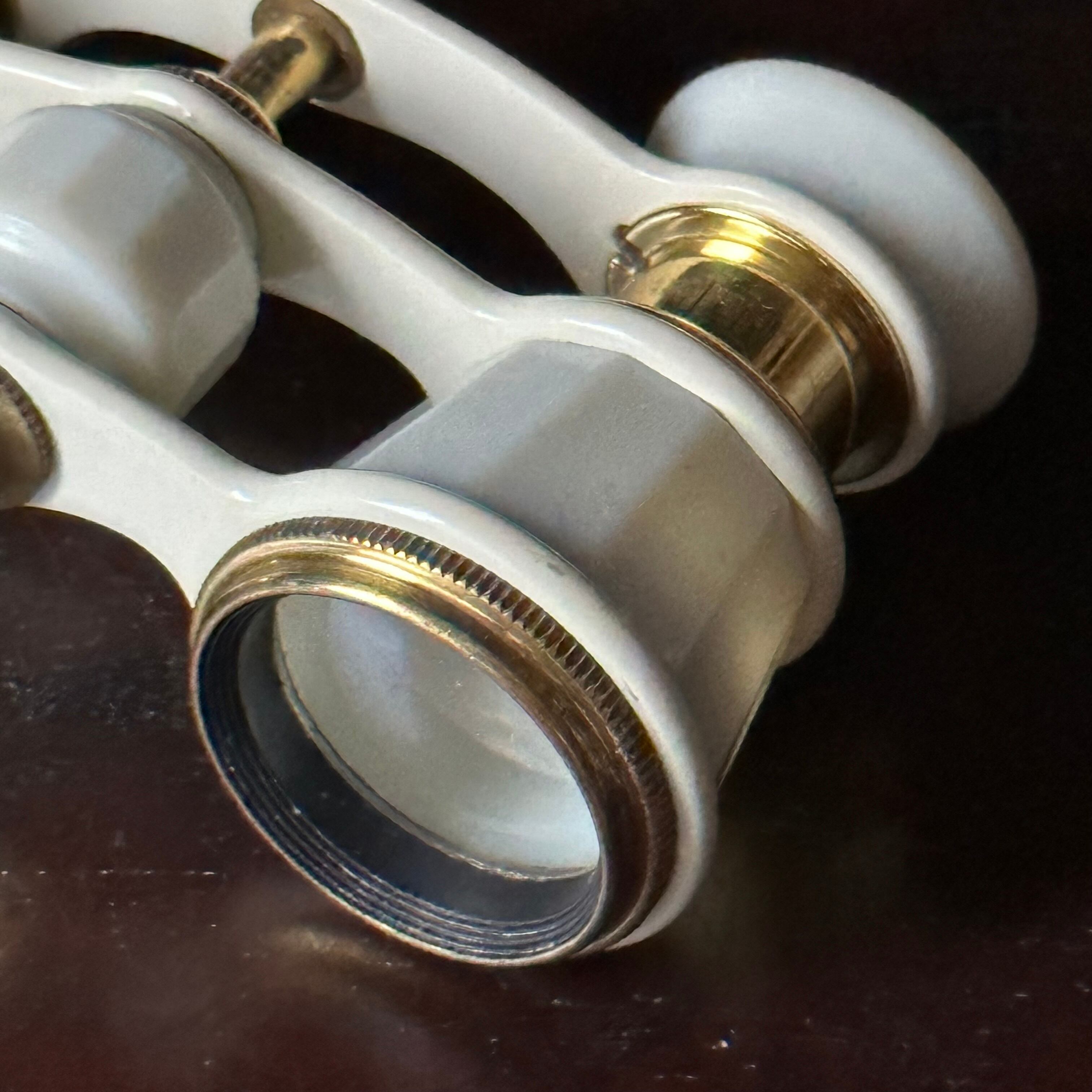 こちらは柔らかなオフホワイトの色合いの中で経年によるくすみがある真鍮金具がアクセントとなっている優しい印象のオペラグラスです。