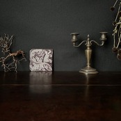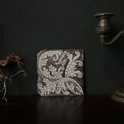 くすんだ深みのあるパープルの濃淡で色付けされており、小さな鳥と動きのある葉の模様が前面に描かれています。