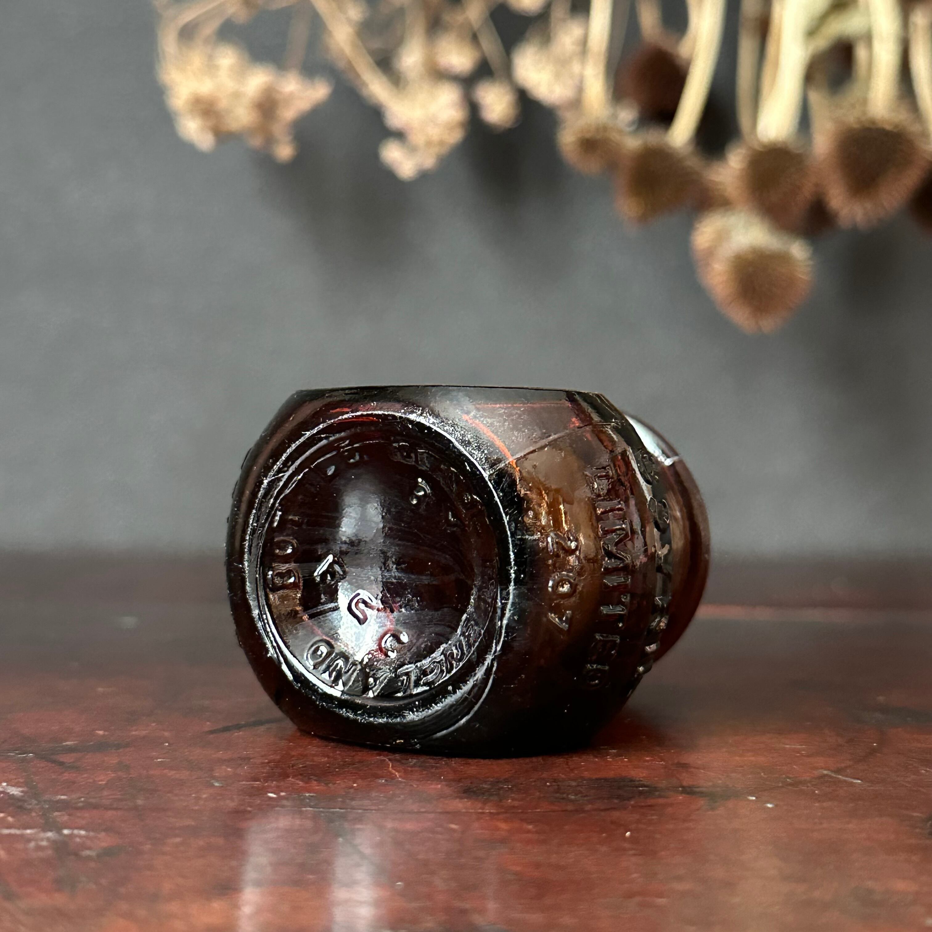 イギリスの蚤の市で見つけた琥珀色の小さなガラスボトルです。