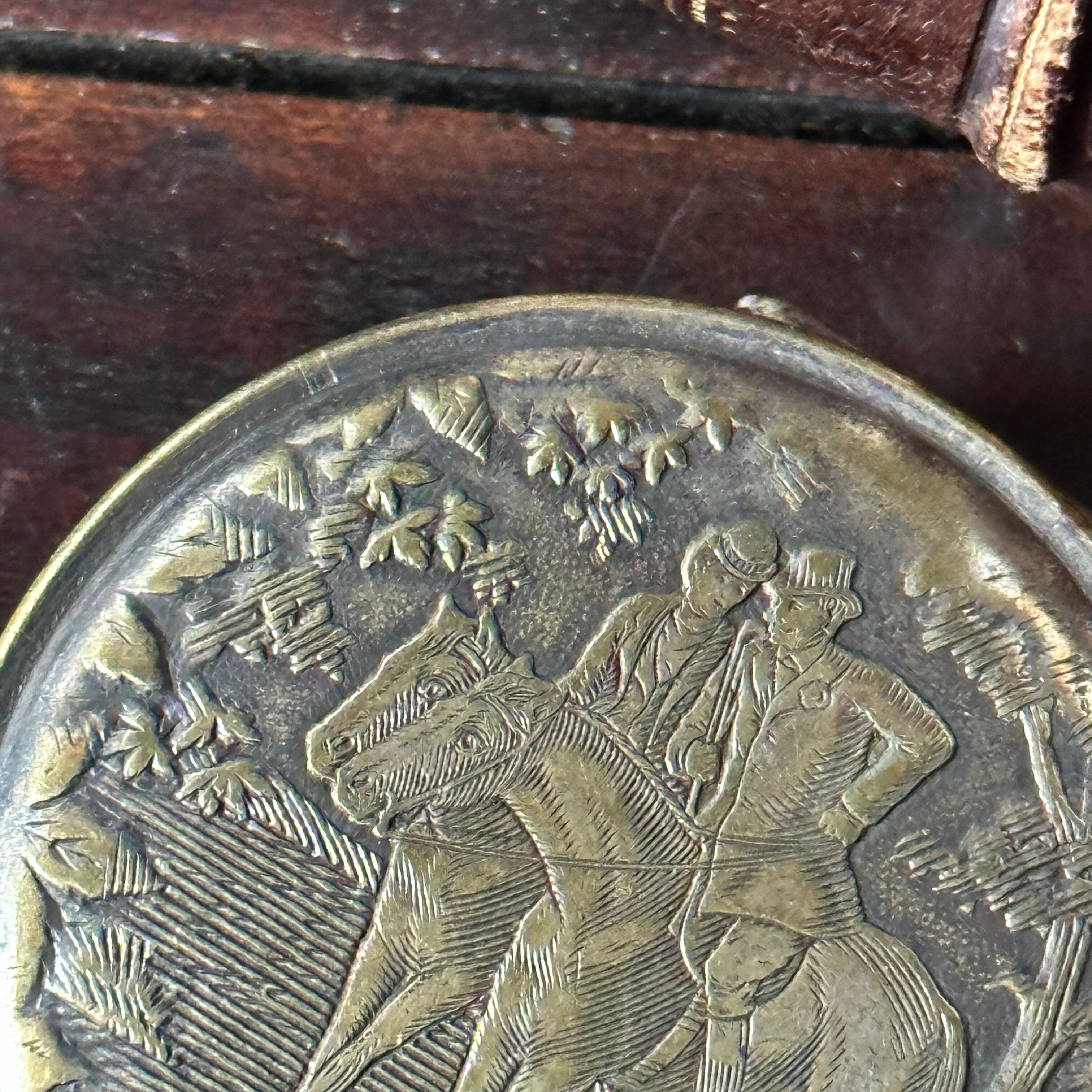 蓋には木々に囲まれた自然の中で乗馬を楽しむ男女が仲睦まじく寄り添うなんとも温かな絵柄のレリーフ装飾、側面と裏面には大変細かな模様がふんだんに施されており、どこから見ても感心してしまうほどに繊細な美しさがあります。