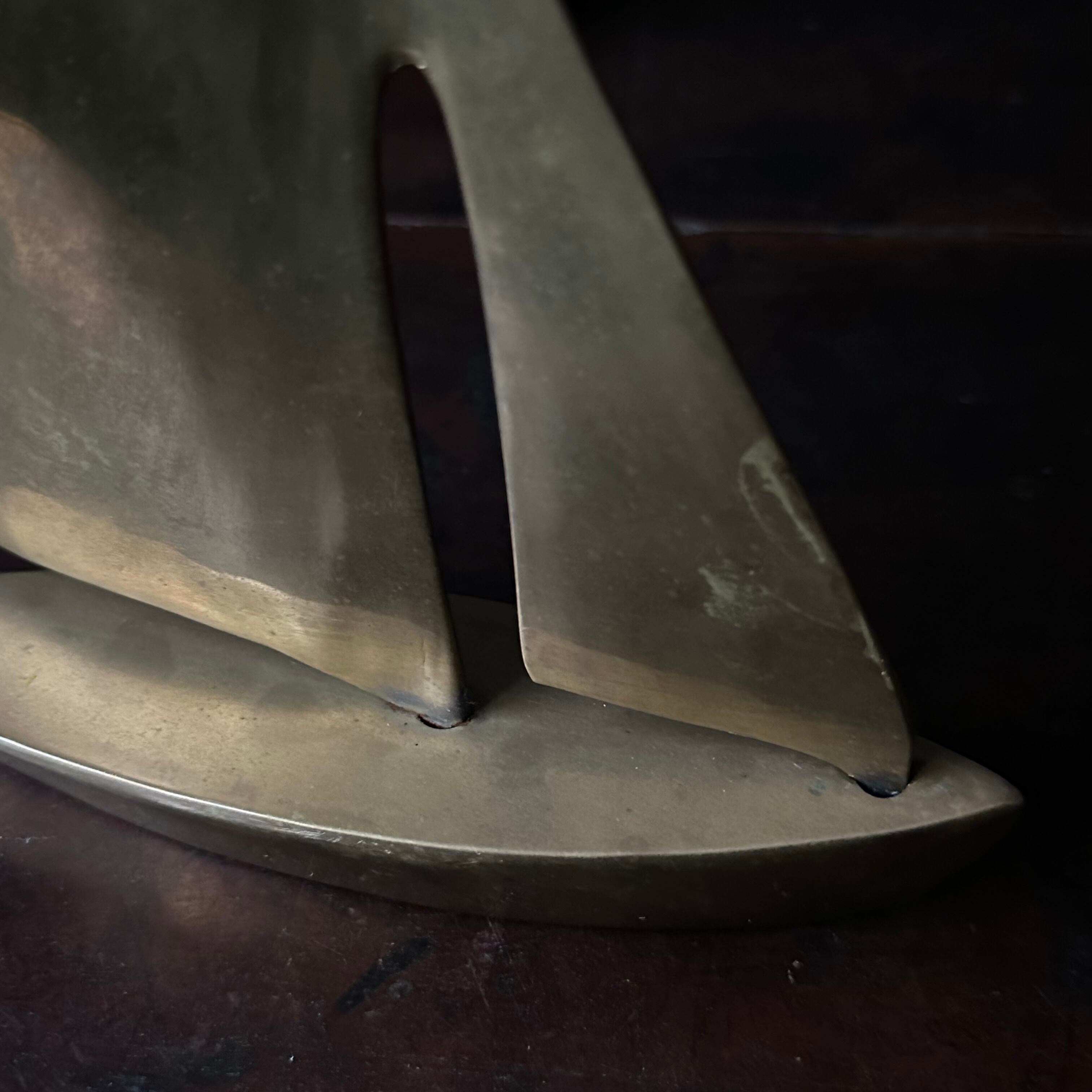 重厚感と存在感が抜群のこちらのお品は真鍮で作られているため、ずっしりとした重みががあり帆は下の土台とネジで留められた作になっています。
