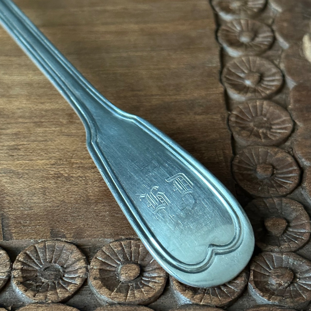 こちらは持ち手の裏側にある菱形の「ALFENIDE」マーク より1855~1862 年に作られたものと分かります。クリストフルは1830 年創業したフランスのシルバーウエアの老舗でALFENIDE (アルフェンディ) は1888年にクリストフルの傘下に入った銀細工工房。