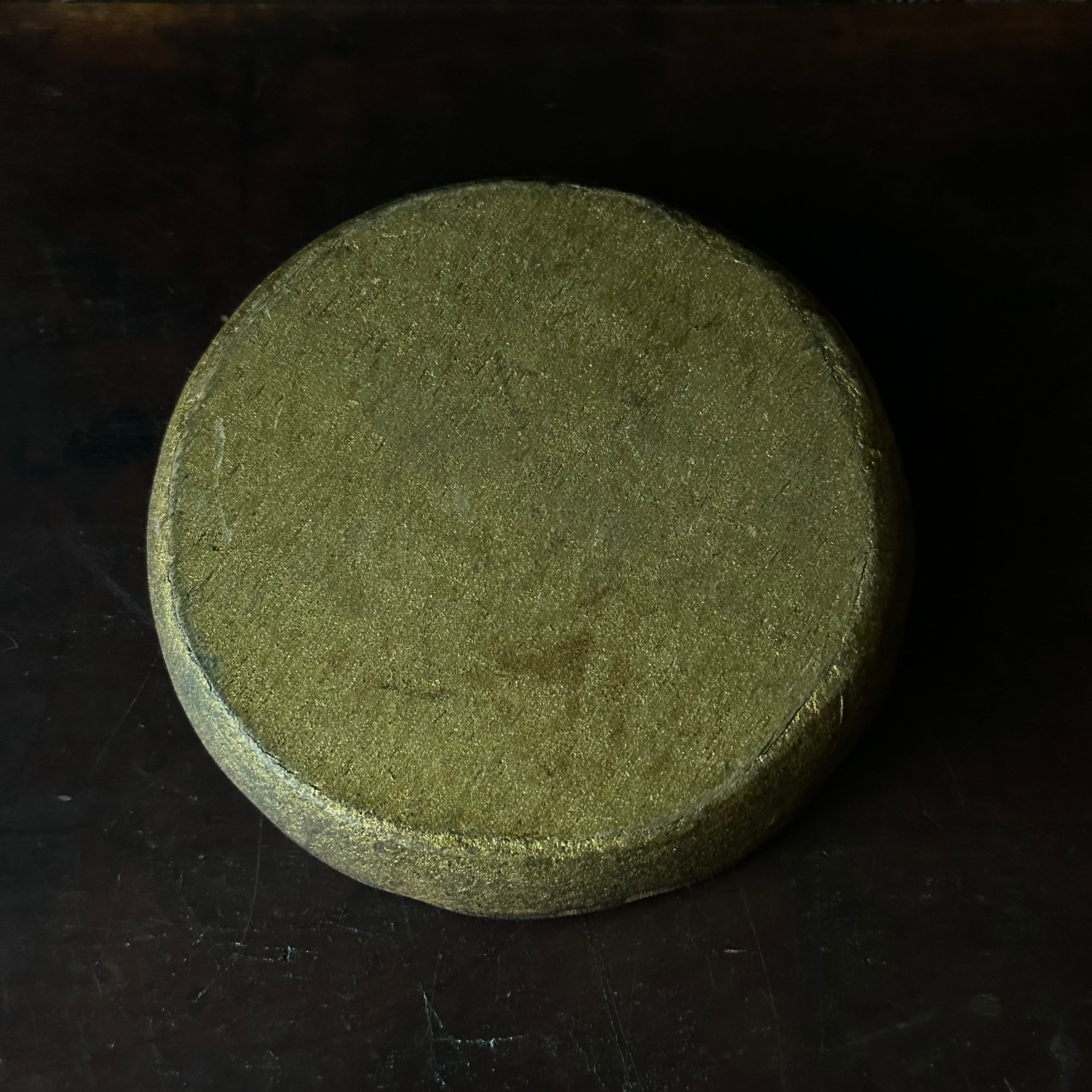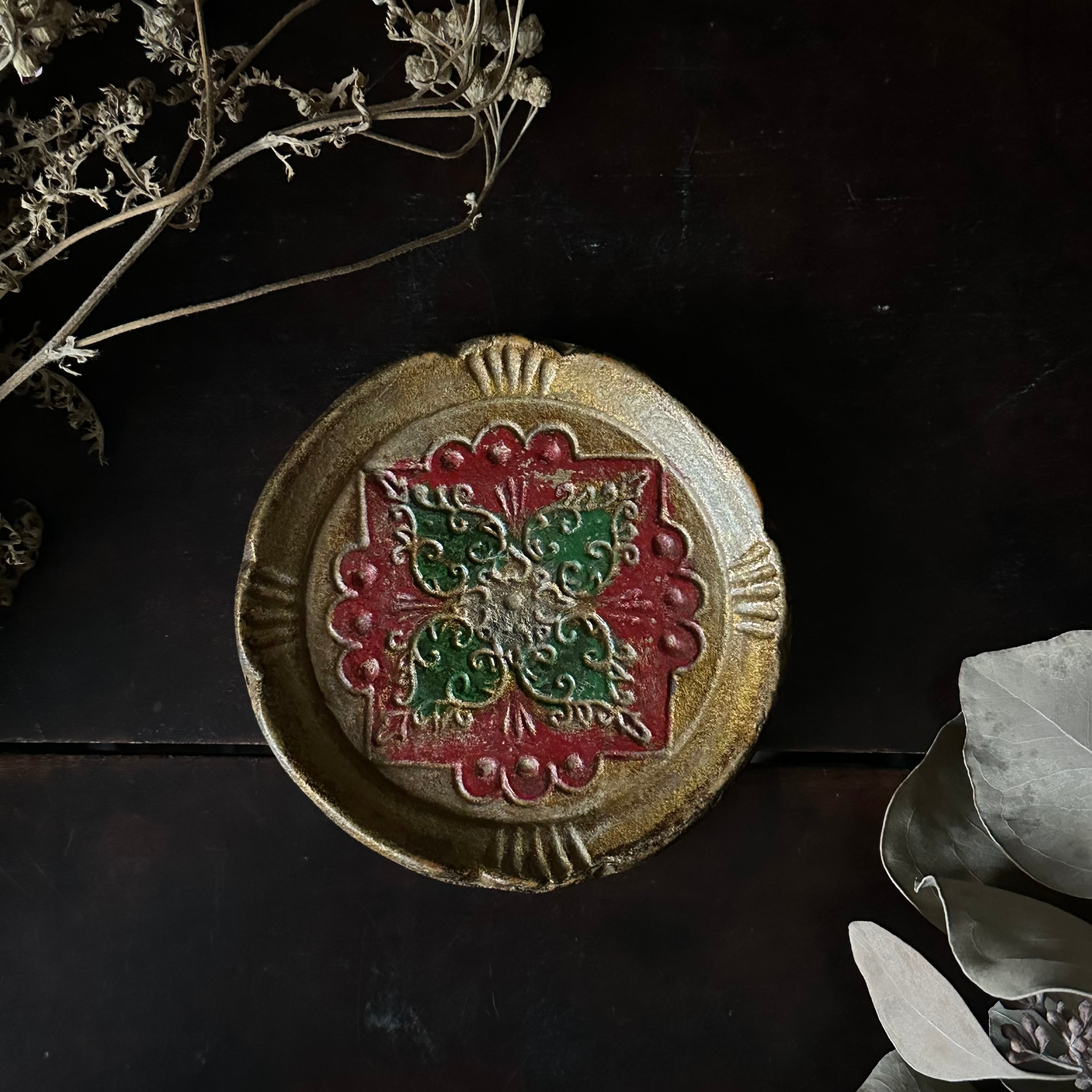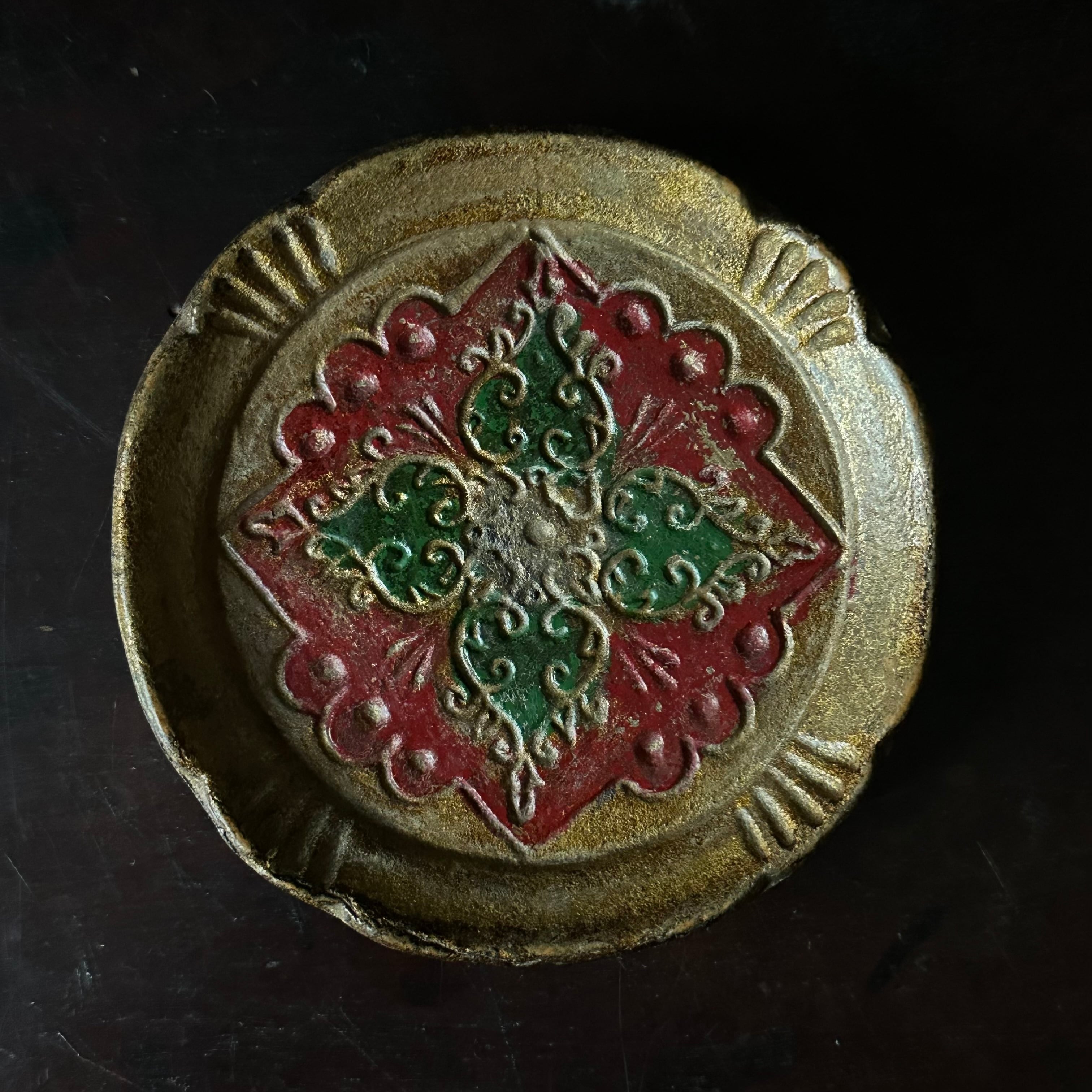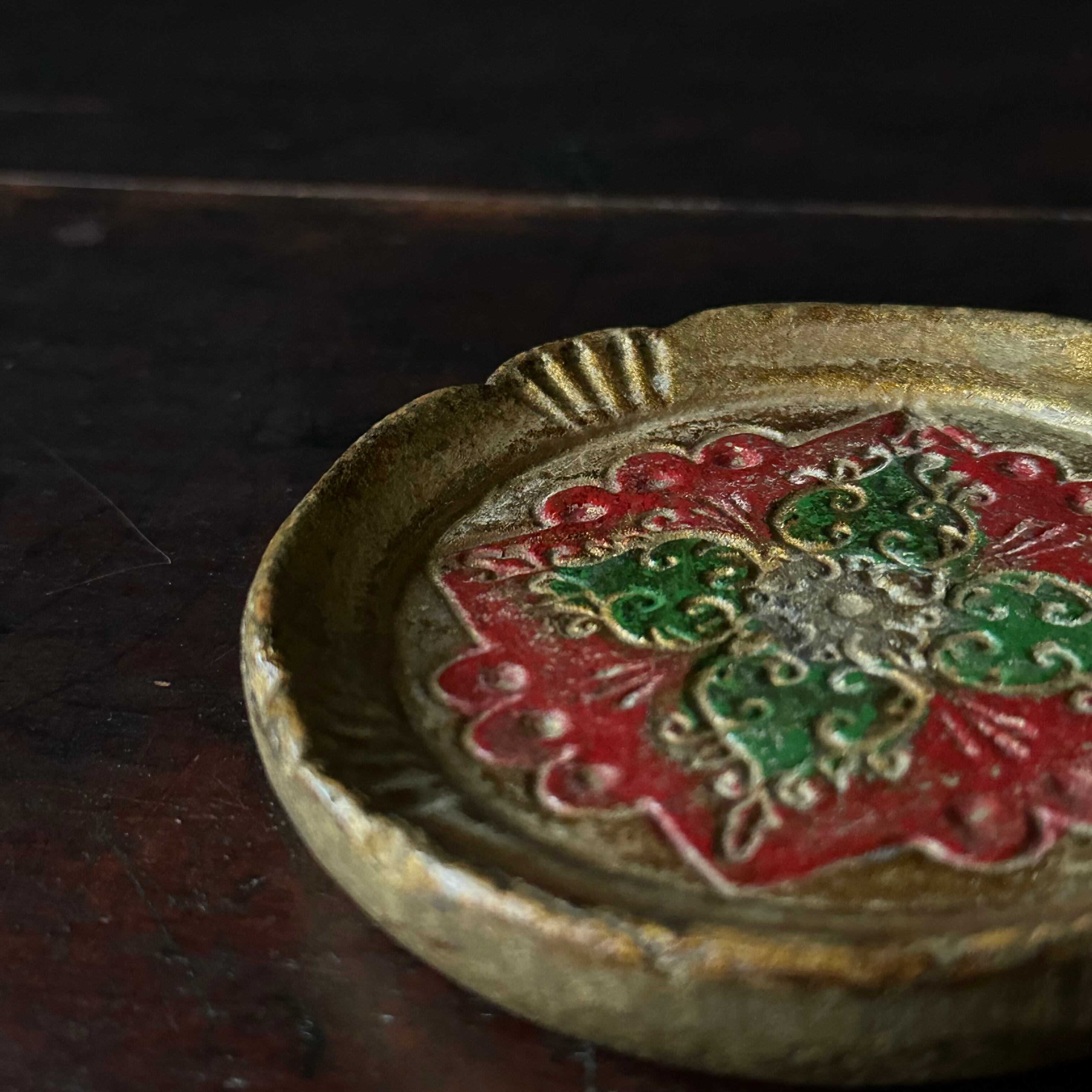 木製ですが、凹凸のある型押しの模様に全体には渋みのある金彩が施され、中央の鮮やかなペイントがアクセントとなっている、小さな可愛らしい雰囲気のコースターです。