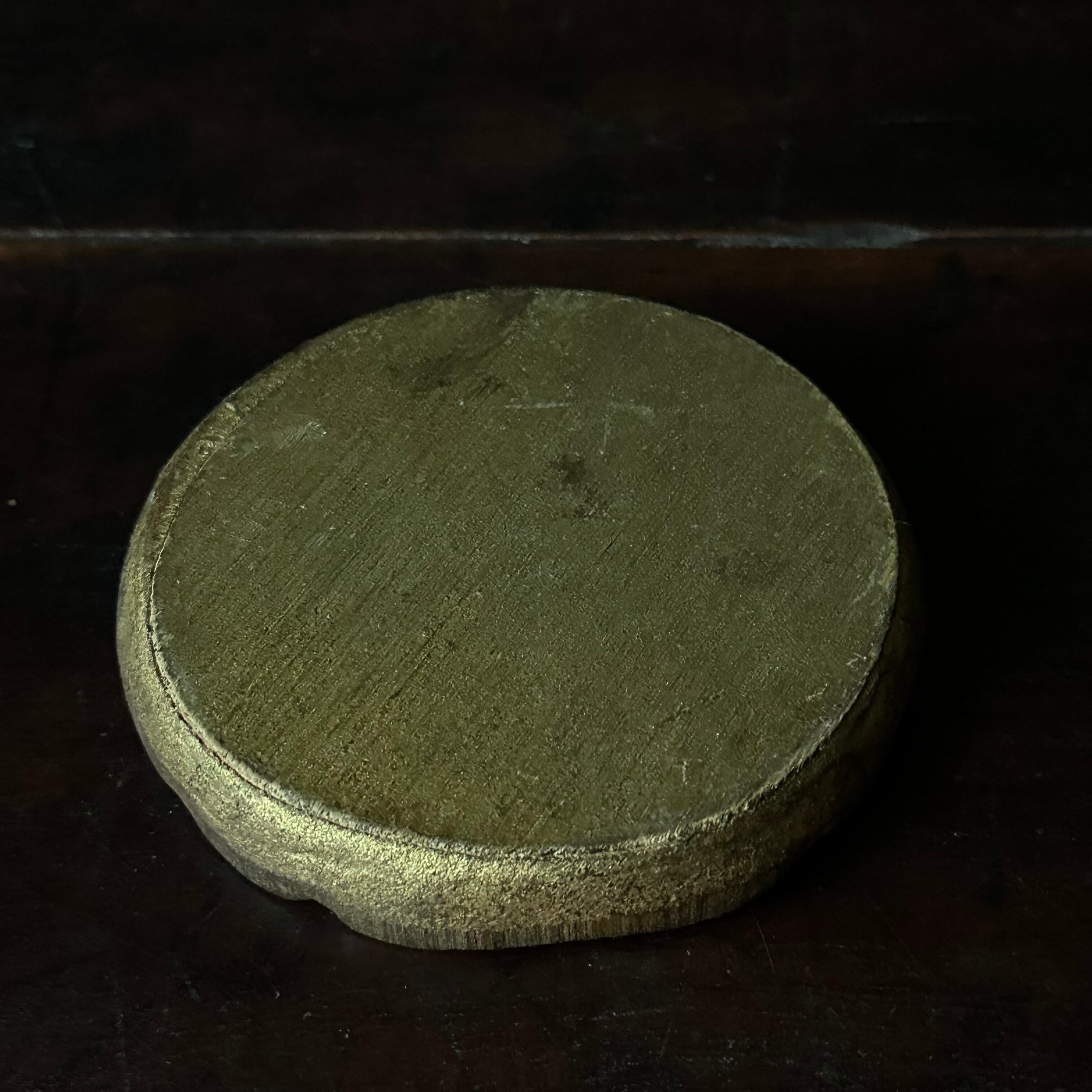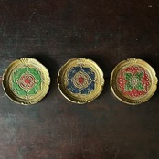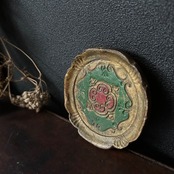 木製ですが、凹凸のある型押しの模様に全体には渋みのある金彩が施され、中央の鮮やかなペイントがアクセントとなっている、小さな可愛らしい雰囲気のコースターです。