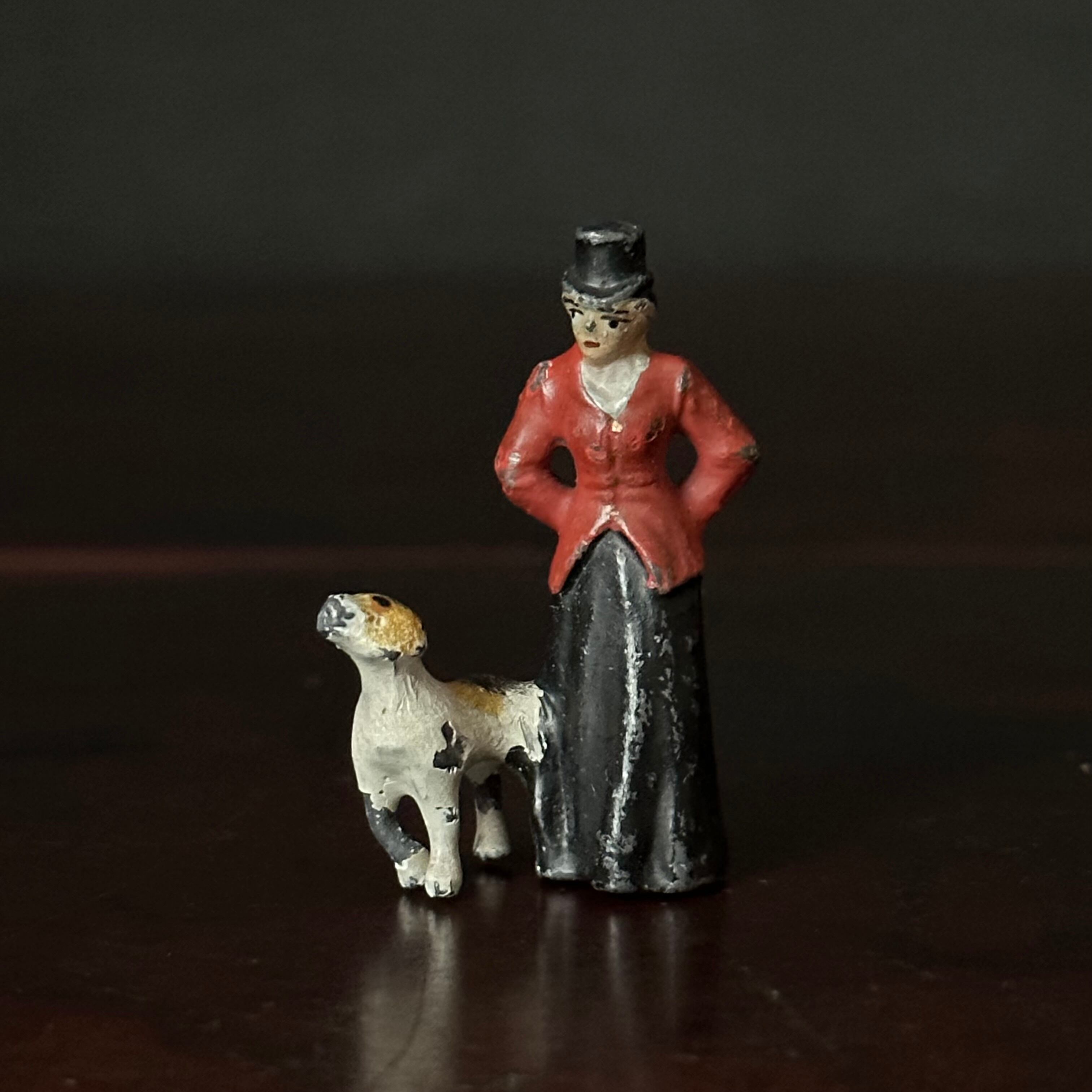 パリの蚤の市で見つけた鉛のオブジェ。ミニチュアの小さなマダムと犬。
