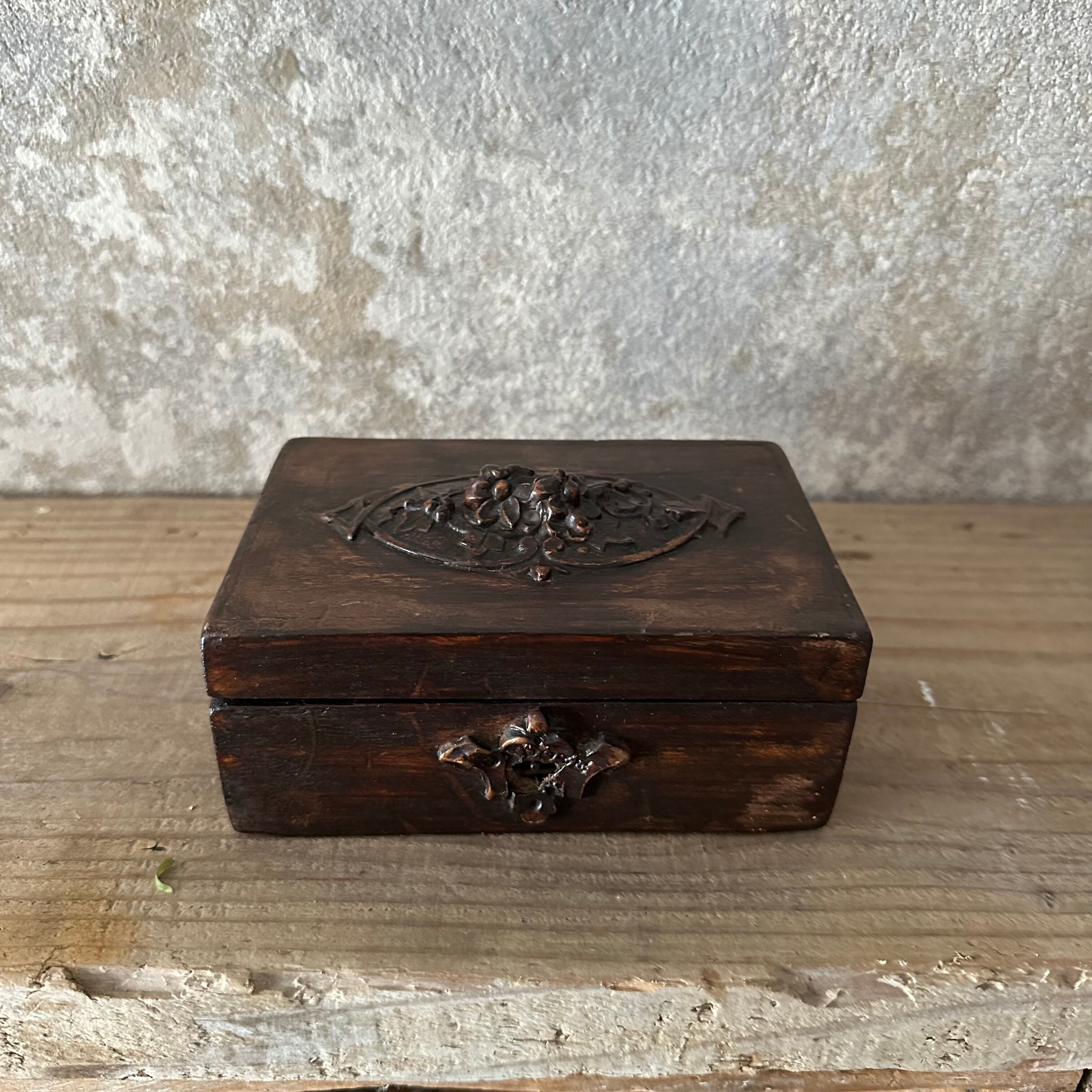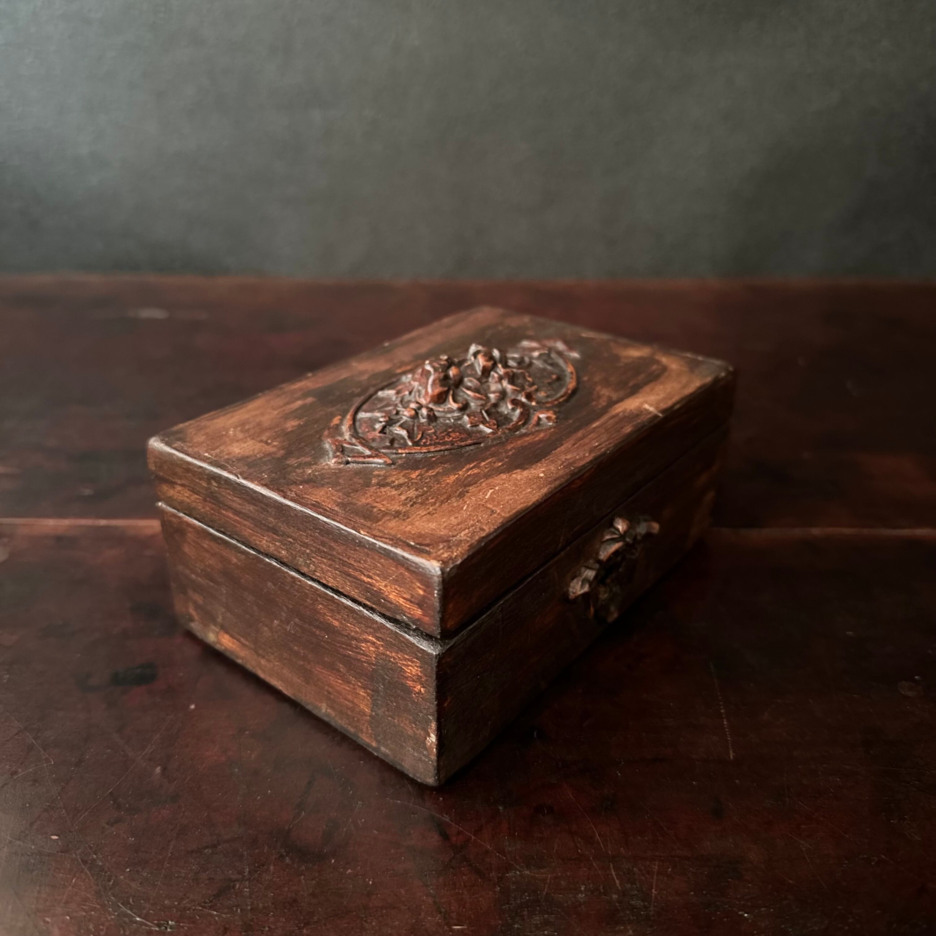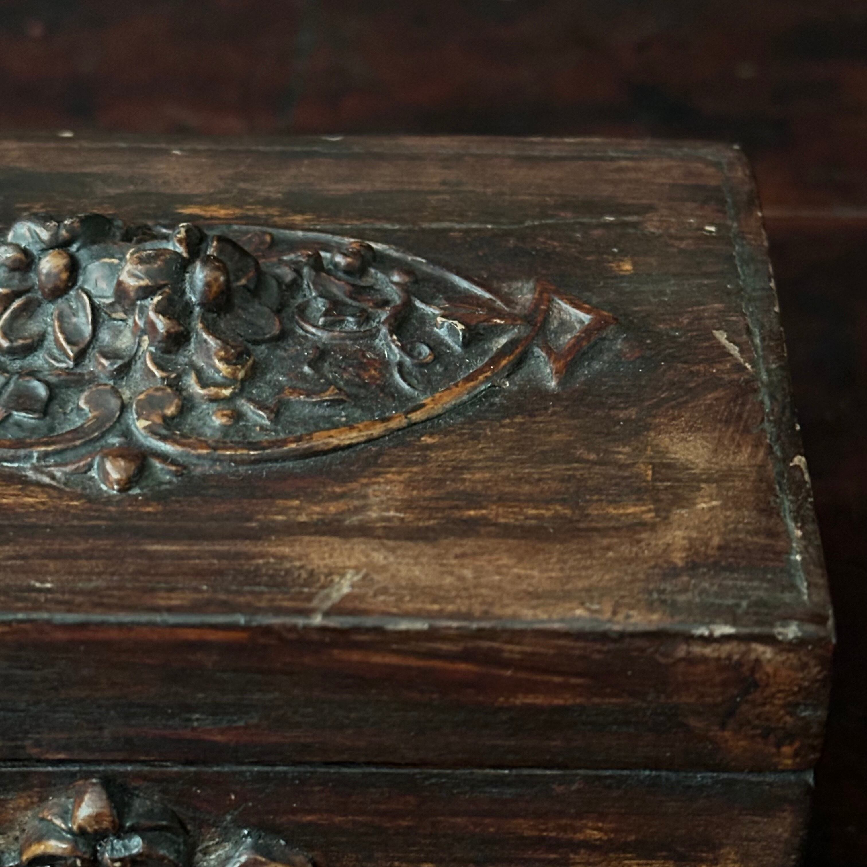 蓋の中央と鍵穴には立体的で凹凸のあるお花の装飾が印象的な宝石箱のような木箱です。装飾も木製で彫って仕上げられているものと思われます。