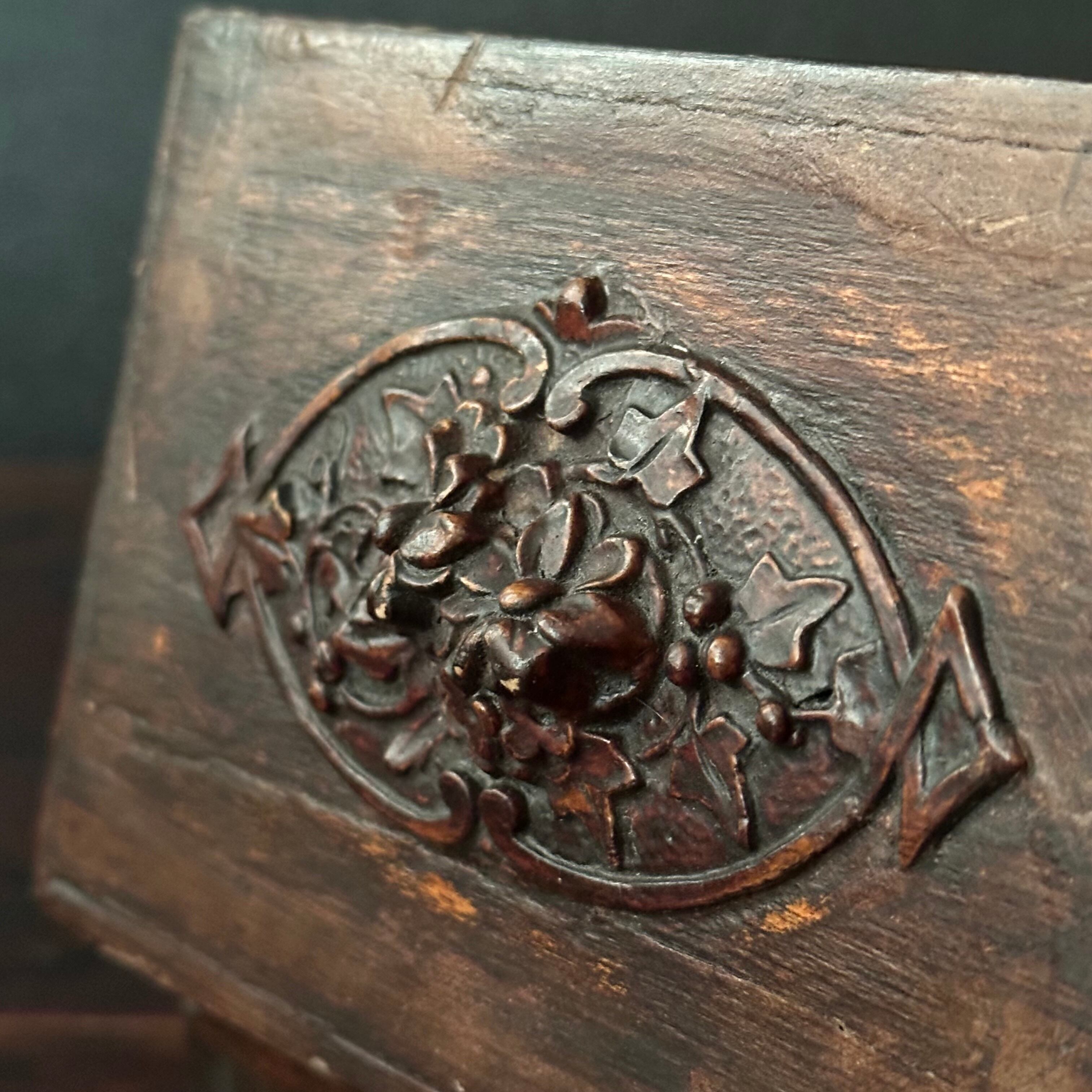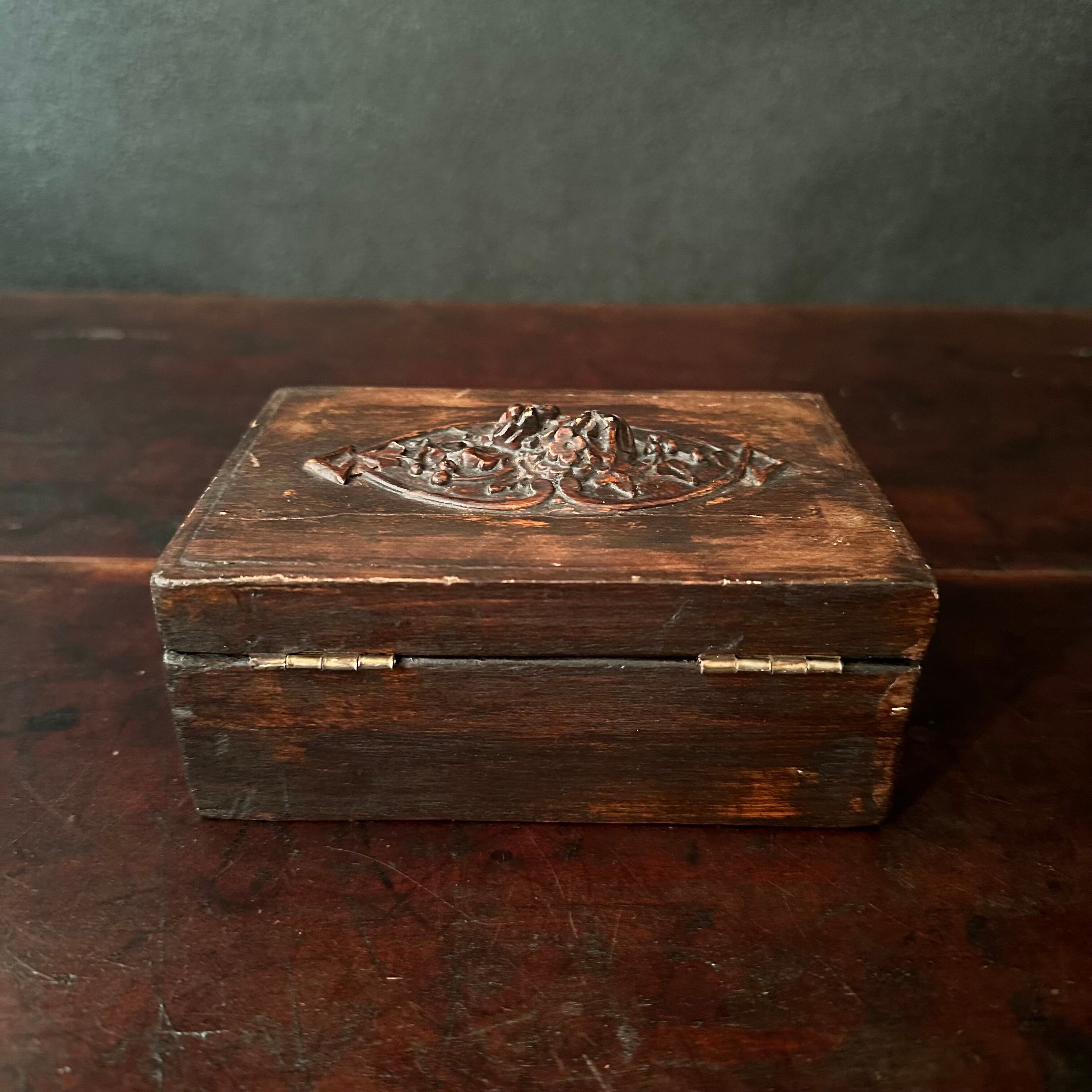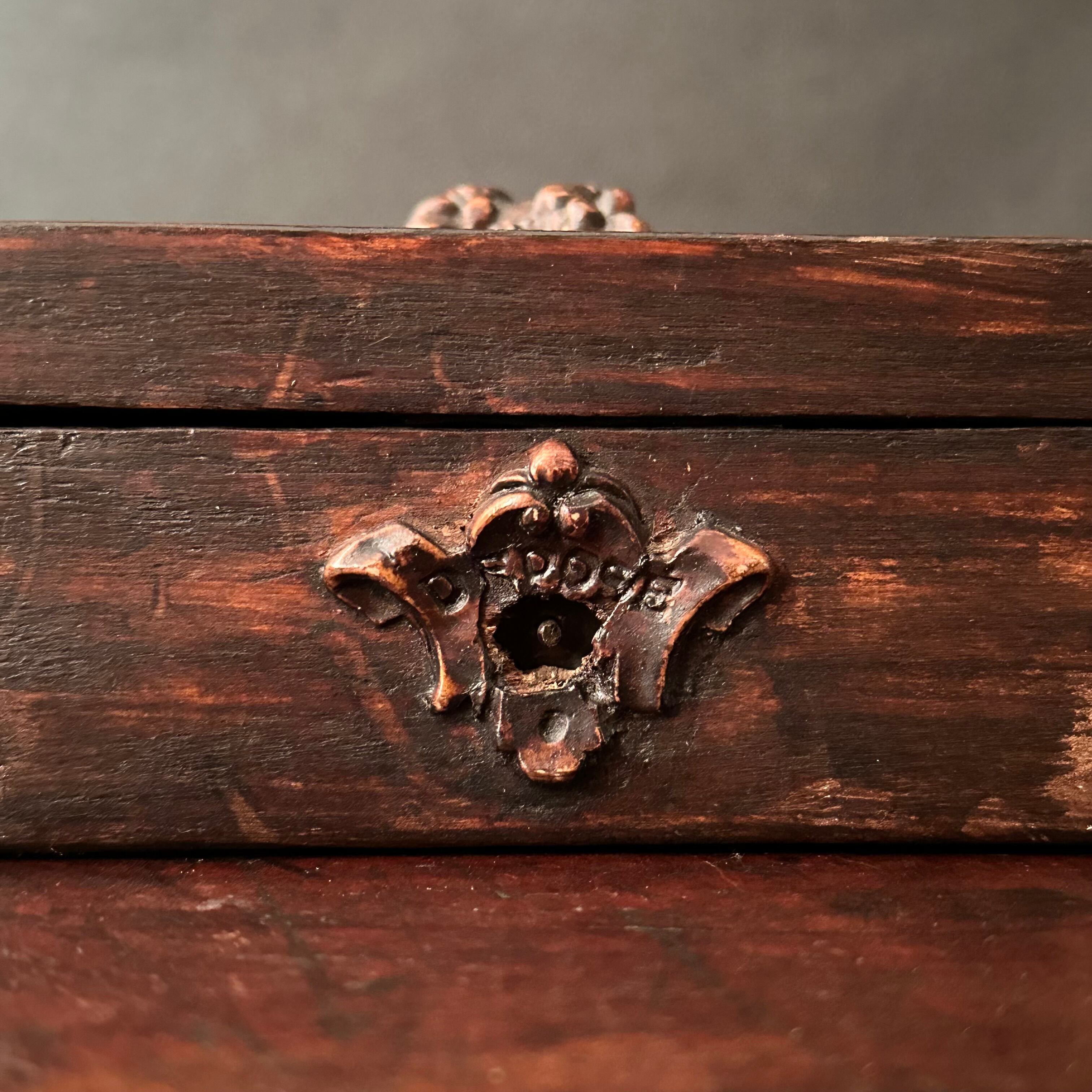 蓋の中央と鍵穴には立体的で凹凸のあるお花の装飾が印象的な宝石箱のような木箱です。装飾も木製で彫って仕上げられているものと思われます。
