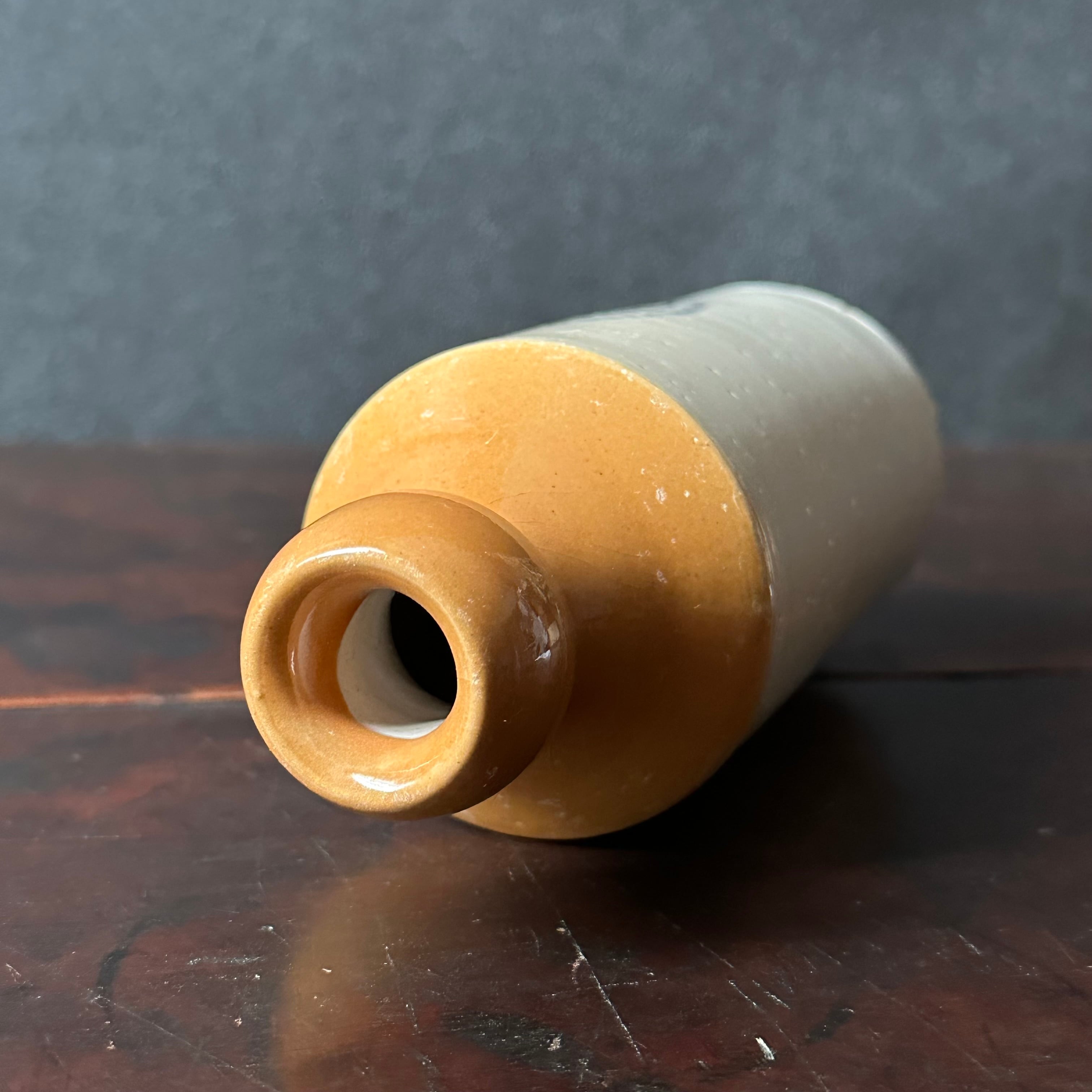 ベージュと明るいブラウンの2色のカラーに温かみがあり、フロントのロゴデザインが目を惹く陶器ボトル。