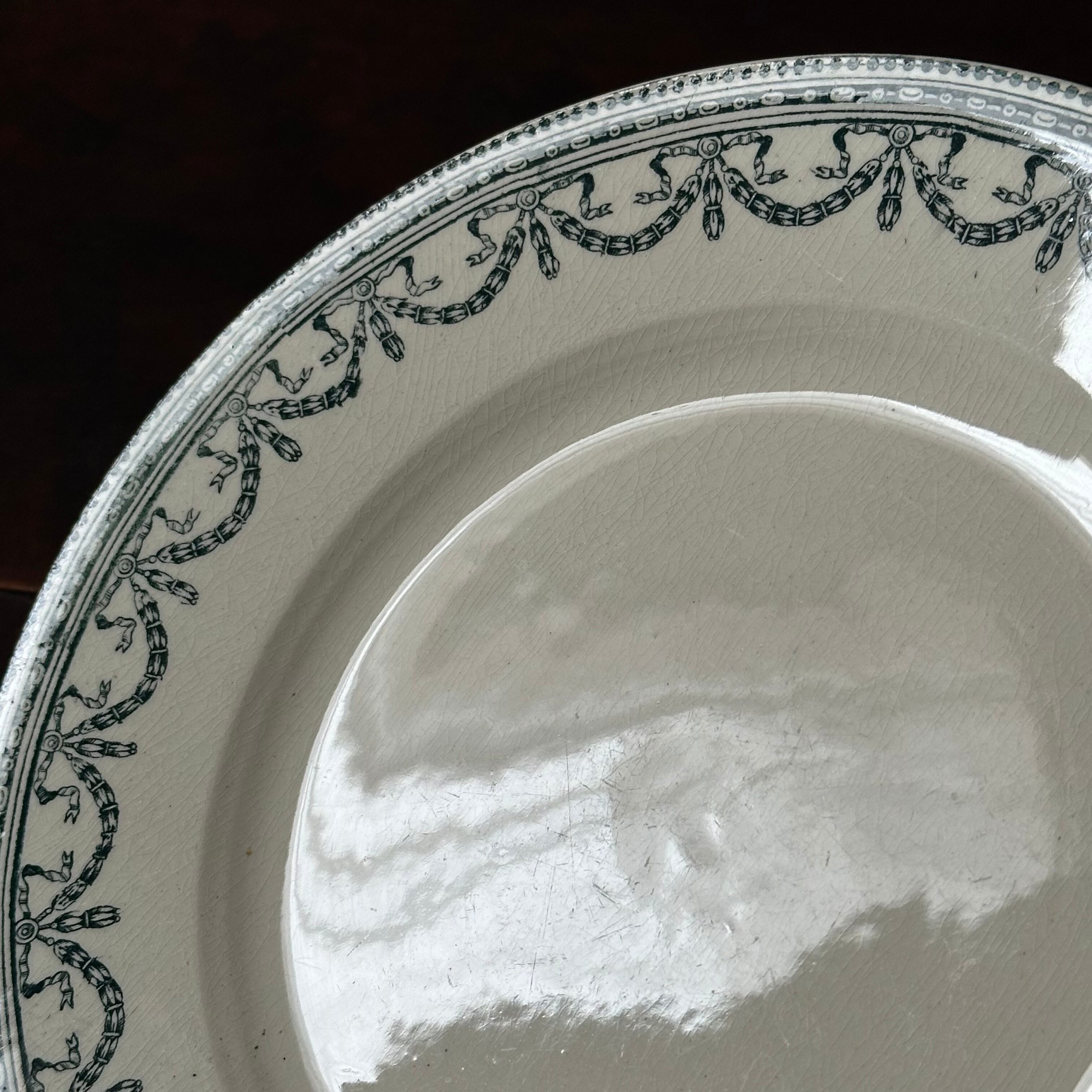 "ルイ16世のガーランド"と言うシリーズで、リボン模様のガーランドがリムを軽やかに彩るデザインとなっています。深いグリーンの落ち着いた色合いと控えめな装飾が上品な佇まいです。