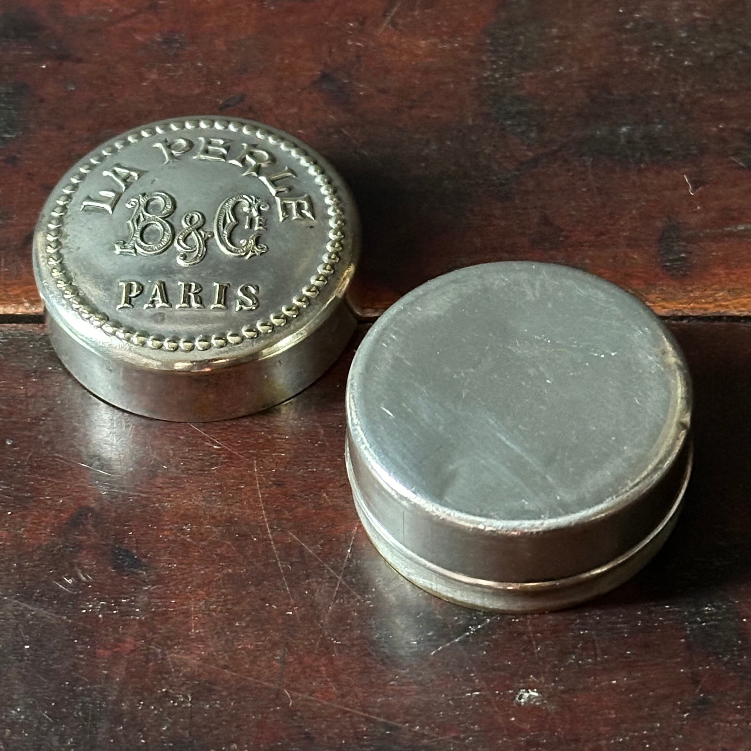 ケースの蓋には「LA PERLE」「B&C」「PARIS」の文字と縁取りの装飾に立体感があり、エンボスの陰影により深みのあるデザインです。文字や装飾はうっすらとゴールドがかった輝きがあります。