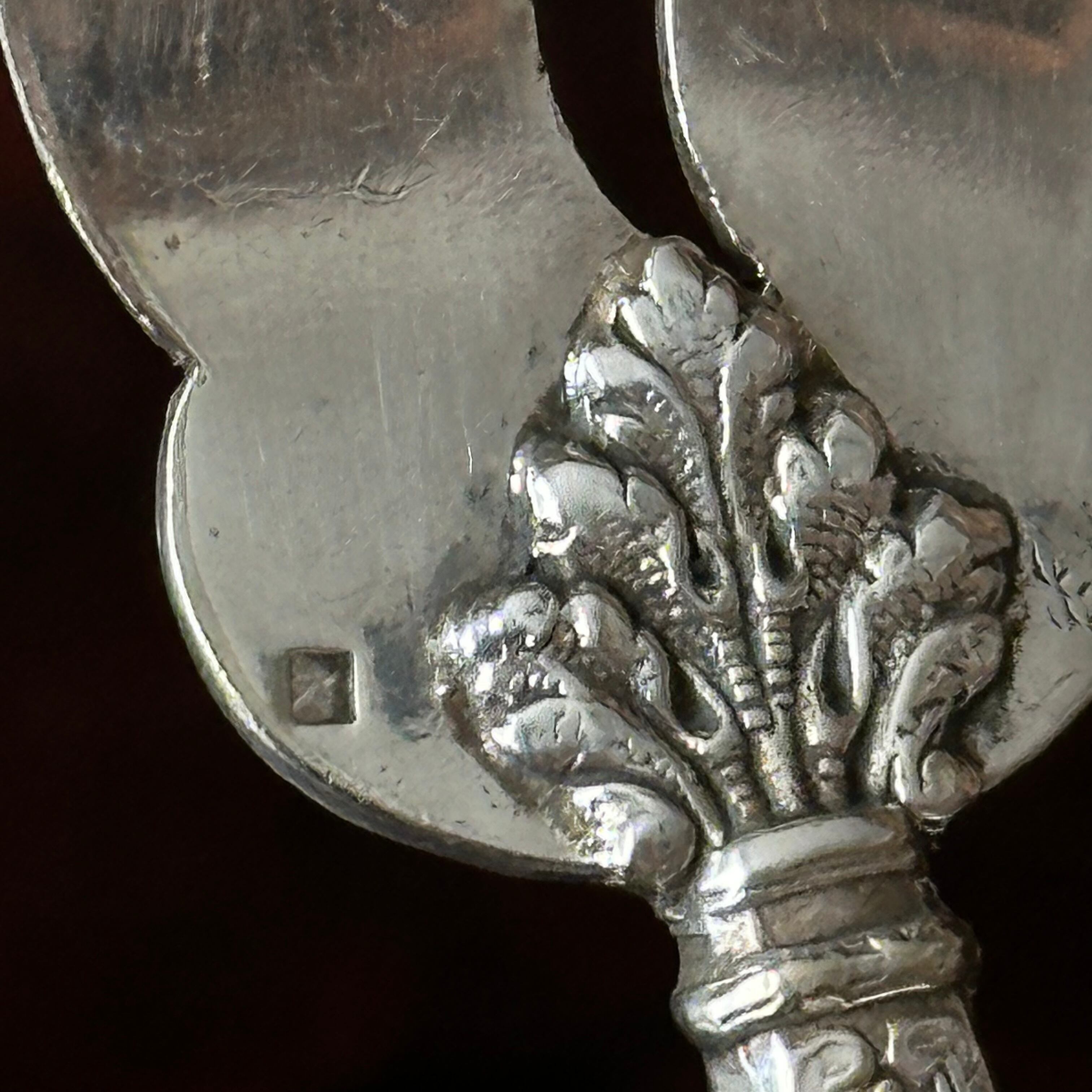 フォークの先にデザインがあるものは珍しくハンドルとの境目にはアカンサスの葉の模様が施されており細部まで美しいカトラリーです。
