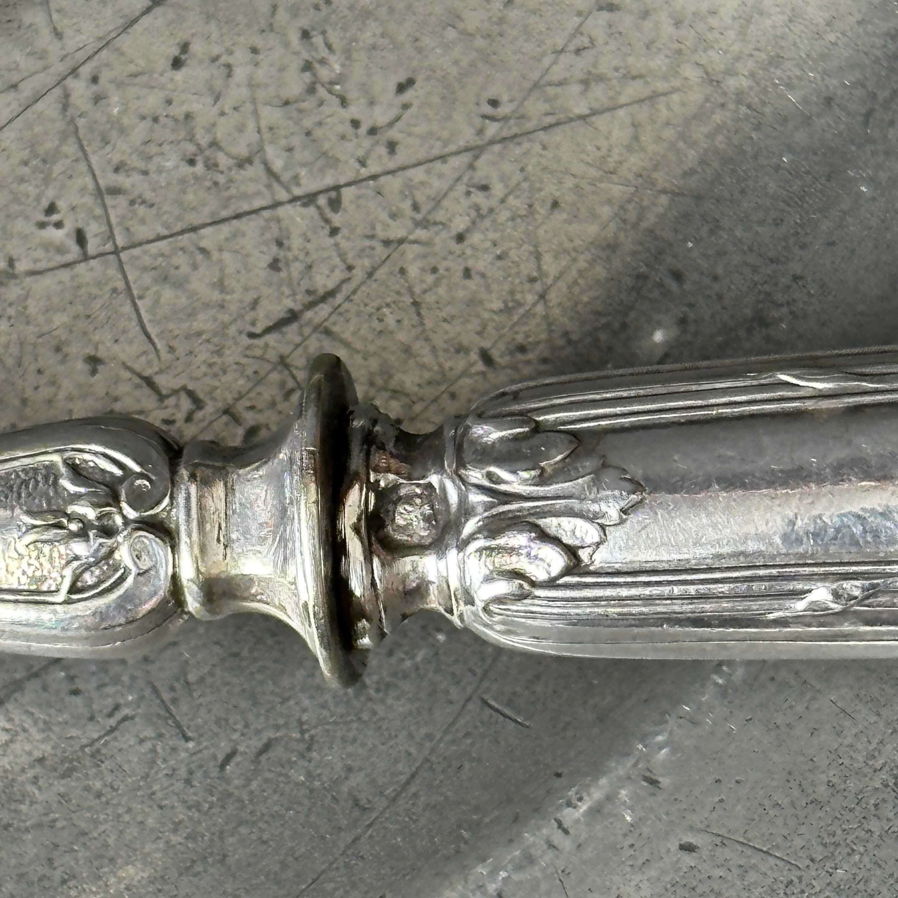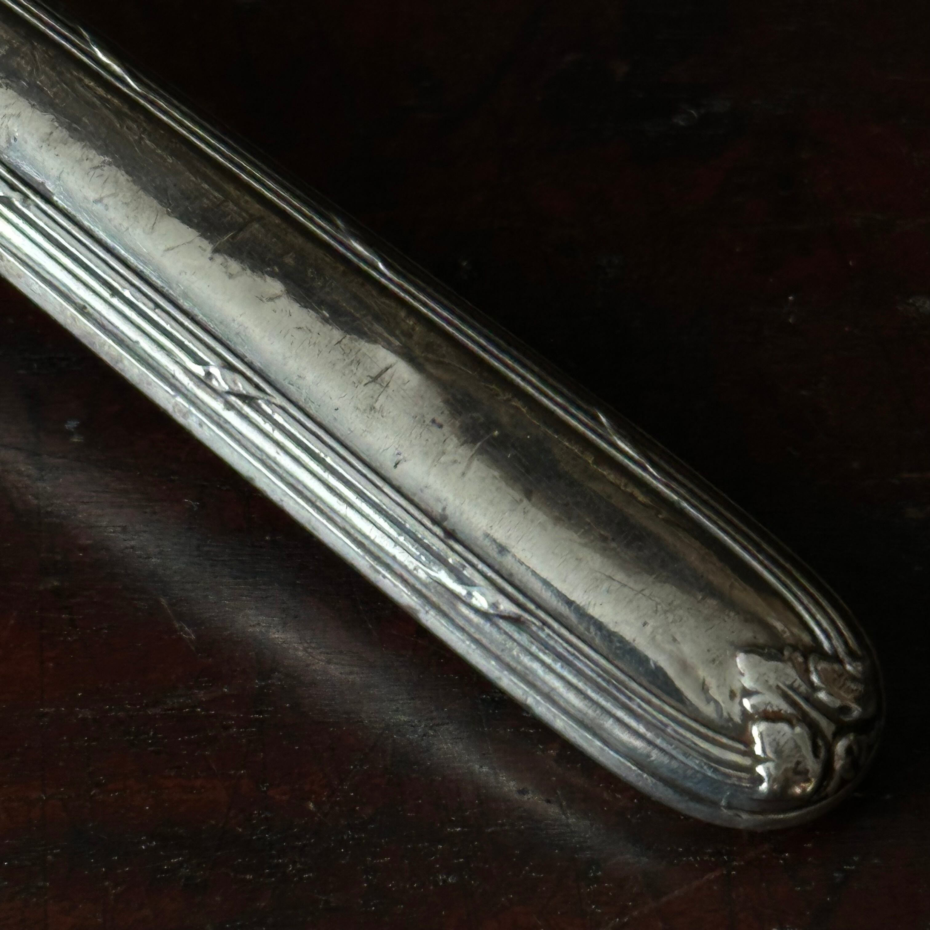 ハンドル上部には刻印が見えにくくなっておりますが、おそらく95%純銀以上のフランスの刻印ファーストミネルバ が押されているものと思います。1838~1973年に作られたシルバーのお品です。