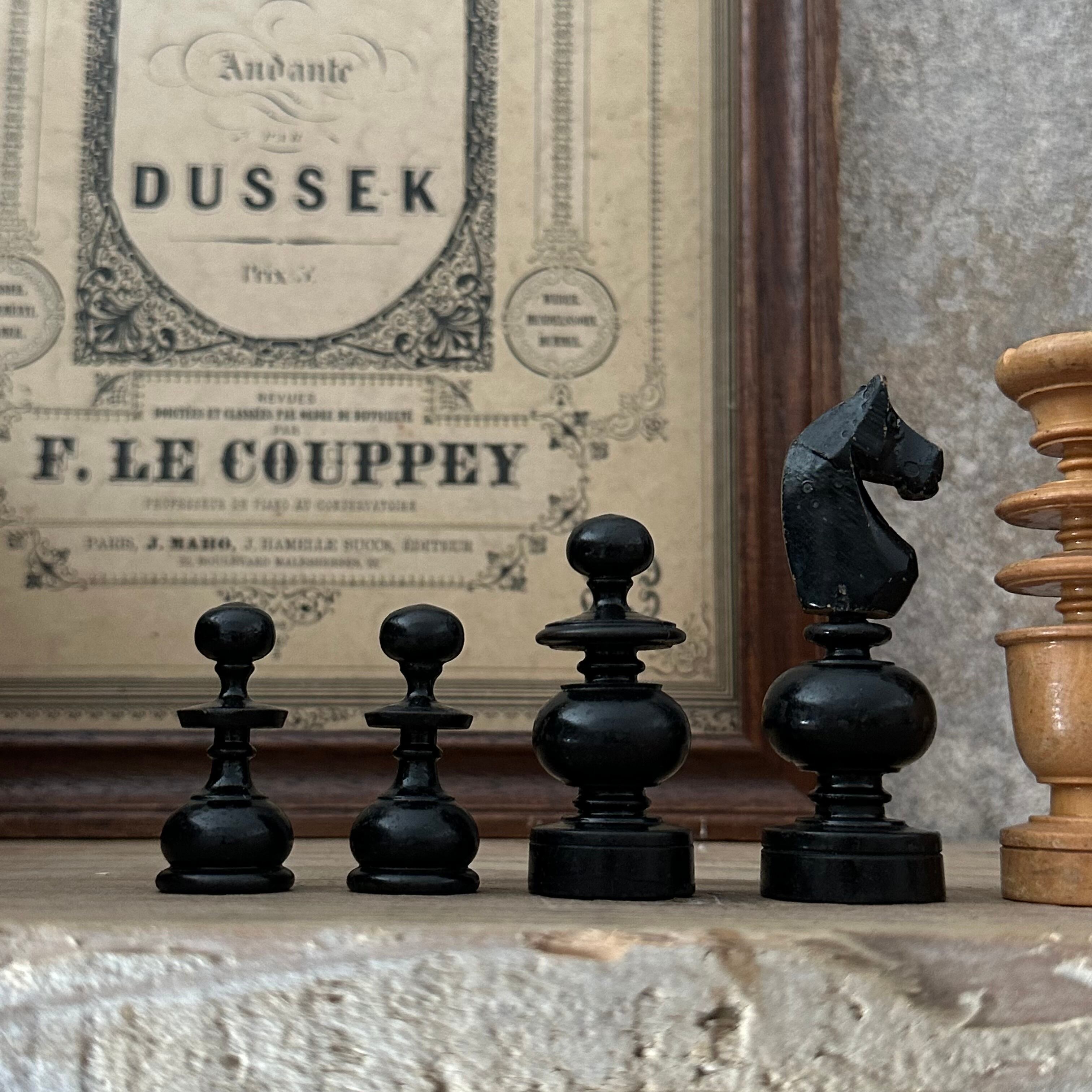 ※古いもののため、長い時を経て刻まれた小さな傷や擦れ、くすみ、汚れなどがあります。また、キングの駒には側面に亀裂が入っています。ヴィンテージの風合いや魅力として感じていただけると幸いです。