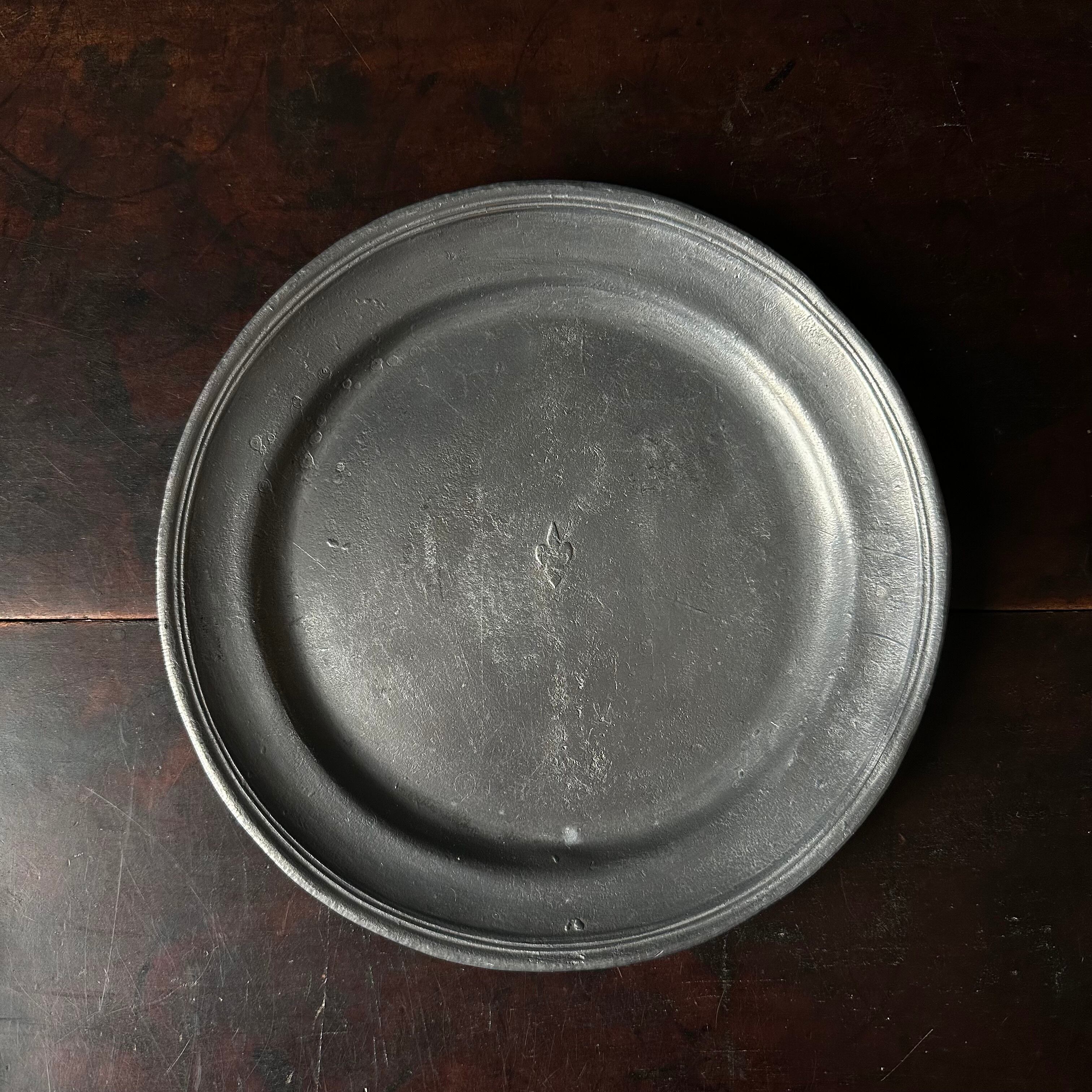 中央にユリの紋章ありますがとても古いものと思われ薄れています。古いピューター独特のマットな質感、金属製なのにしっとりとした触り心地に不思議な魅力を感じます。