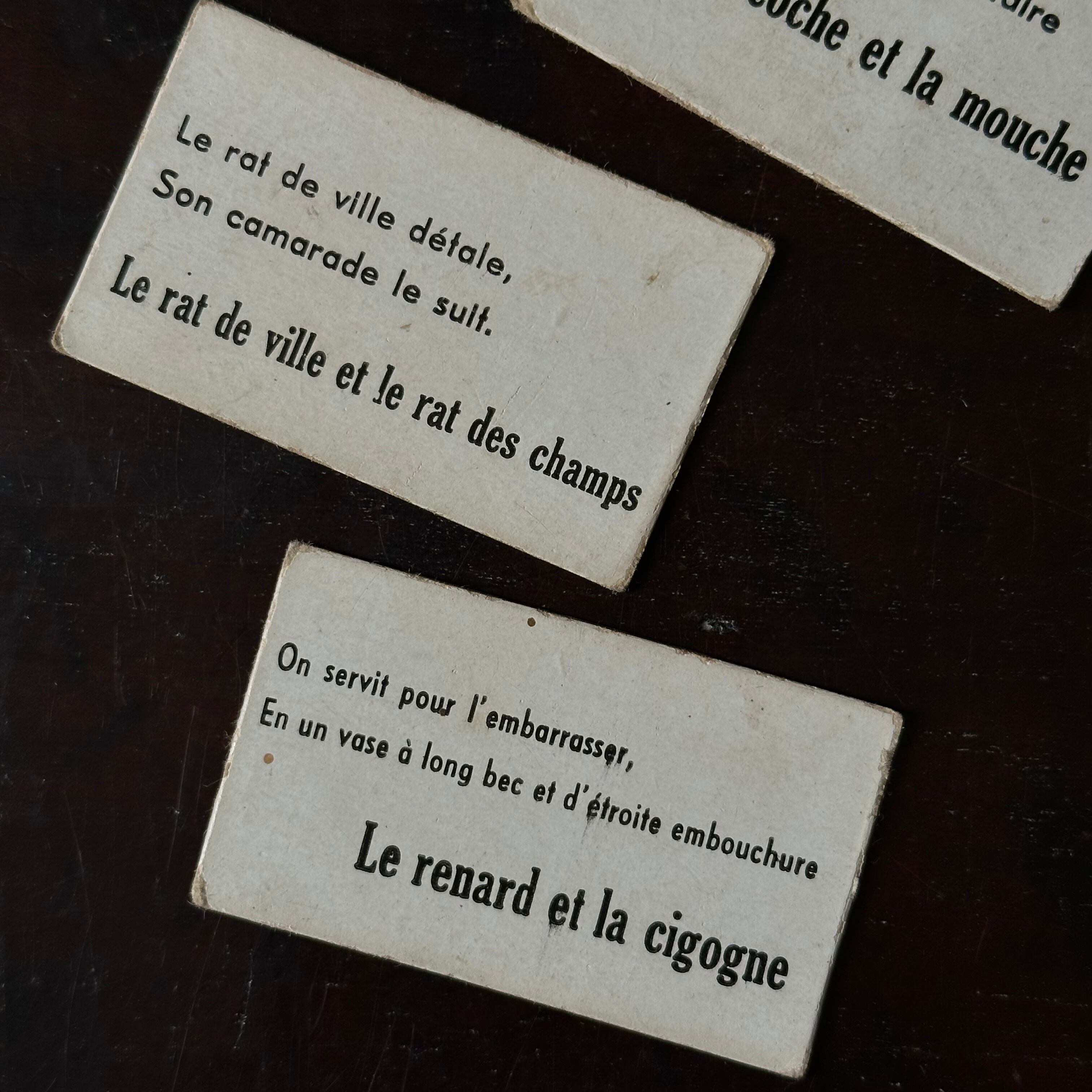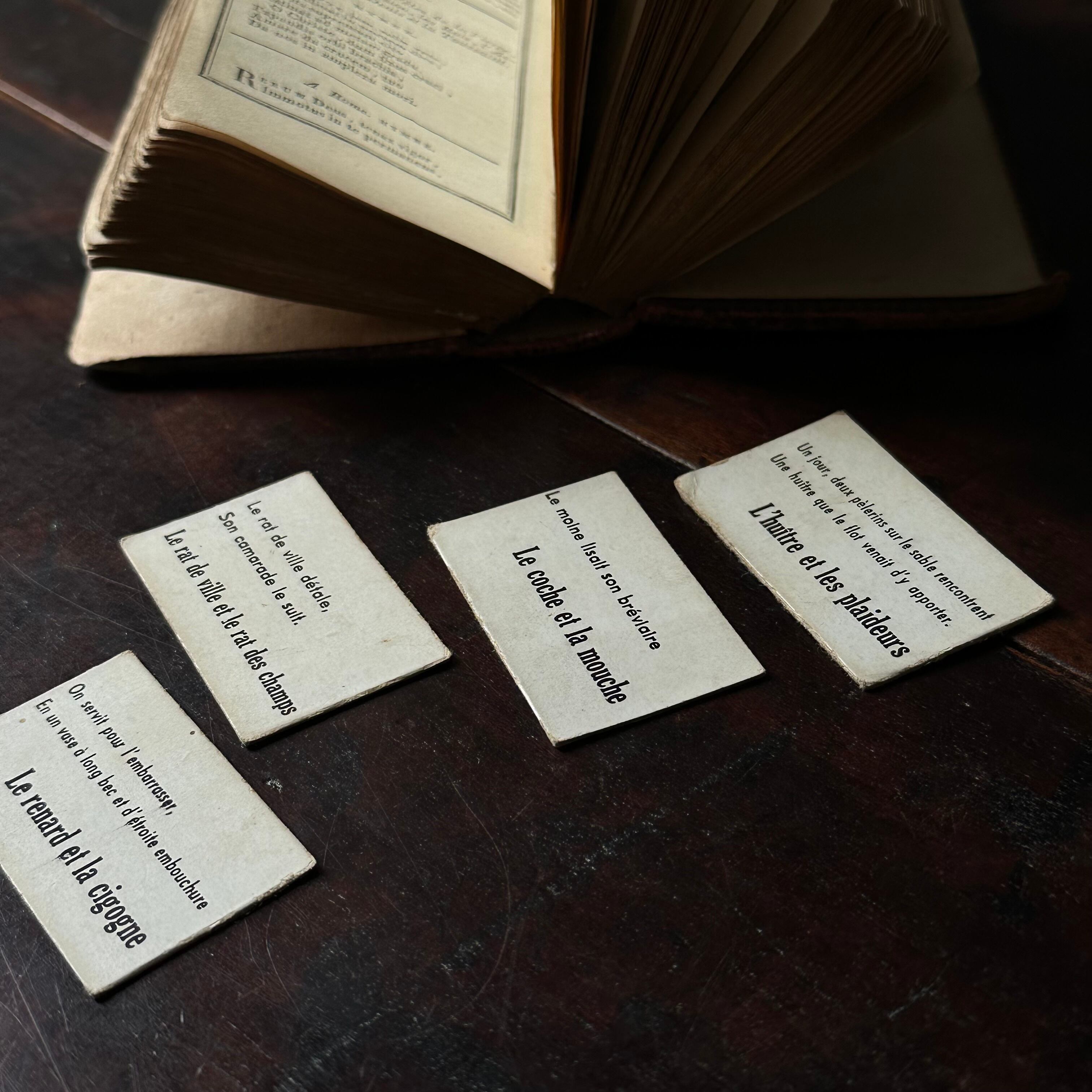 小さな厚紙のカードにはフランス語で文字が書かれています。経年による紙の色褪せが、自然なアンティークの質感を作り出していて趣きがあるカードです。