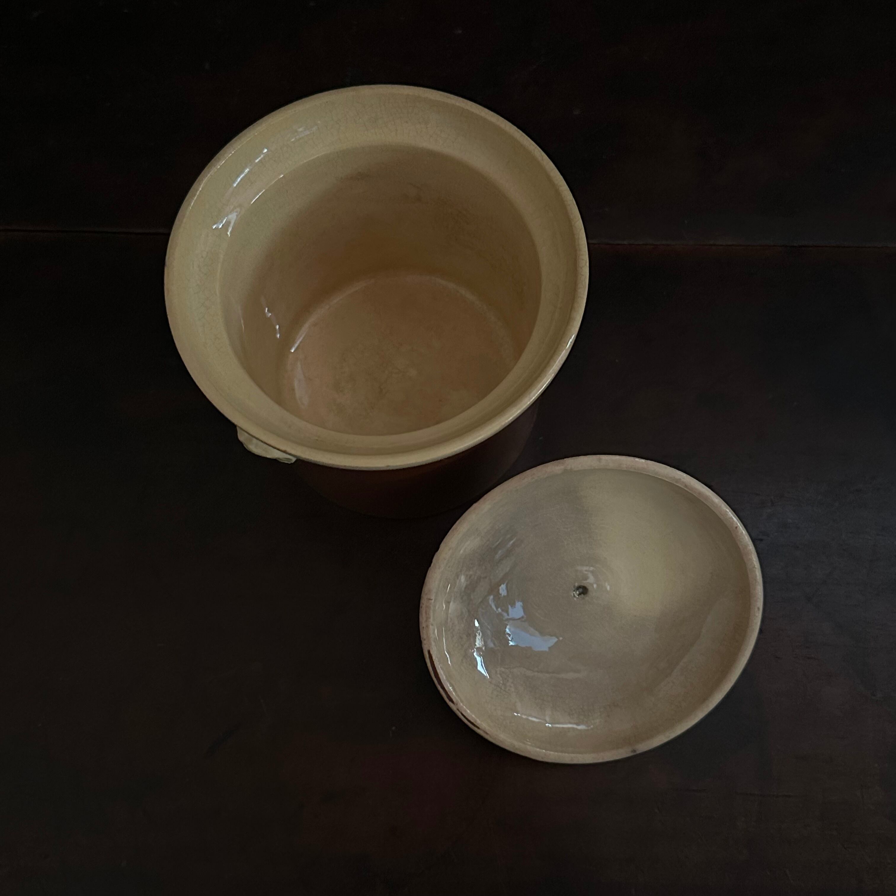 ※1枚目の画像が実物に近い色味になると思います。製造時の色飛びや凹凸、蓋には小さなチップが見受けられますが、大きな欠けはなく時代を考慮しても状態は良いお品と思います。ゆっくりとご検討の上ご注文くださいませ。