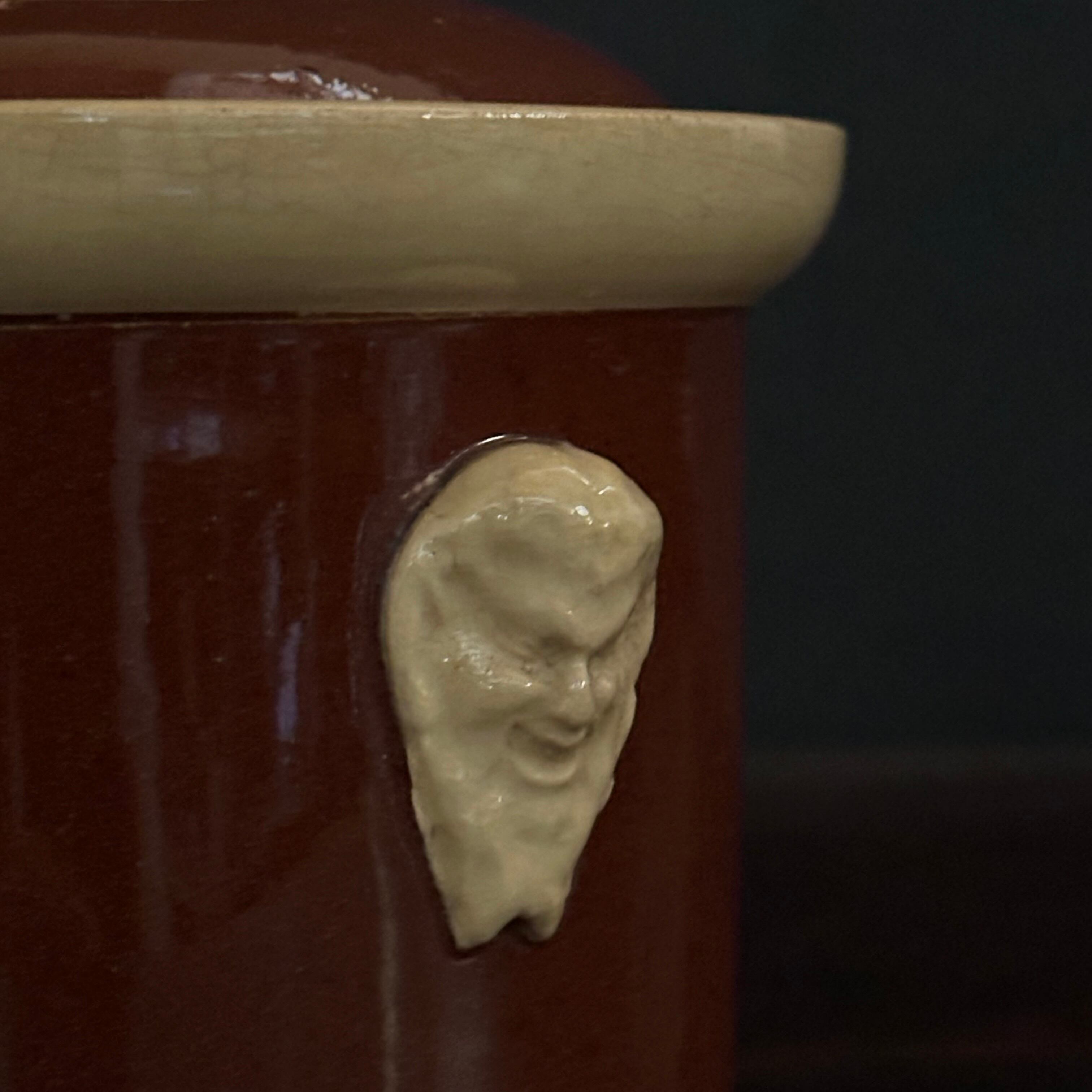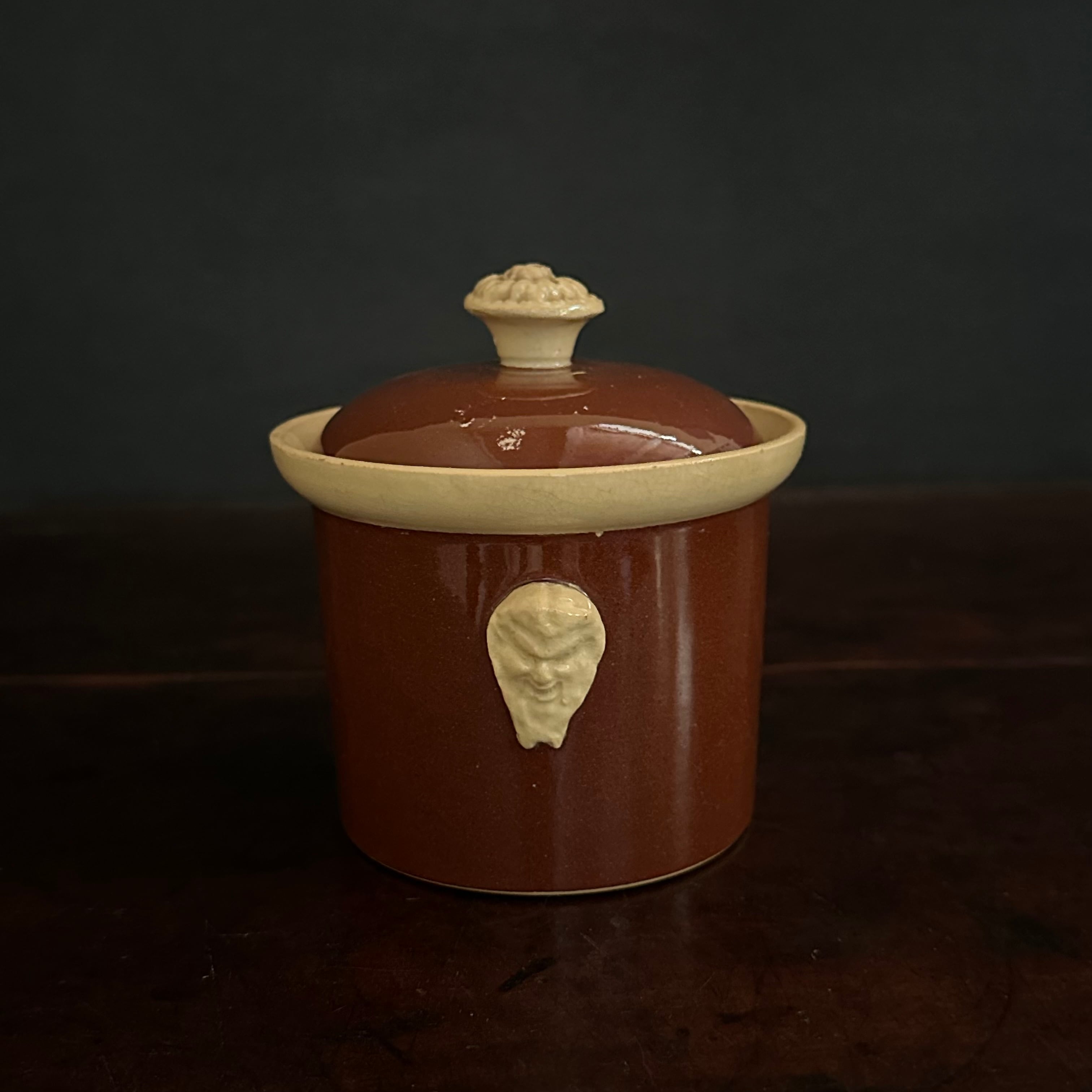 艶のあるブラウンの側面にはサテュロスと思われる立体感ある顔のモチーフが装飾されています。