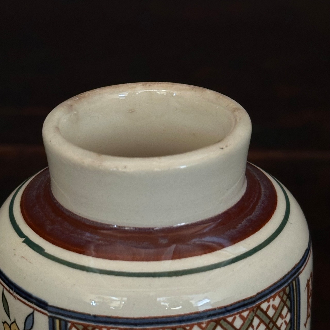 口の部分にわずかなスレと色の染み込み、内部に黒い点のような色付き、底面に小さな欠けがあります。古いものの経年の変化や風合いとして感じていただけると幸いです。